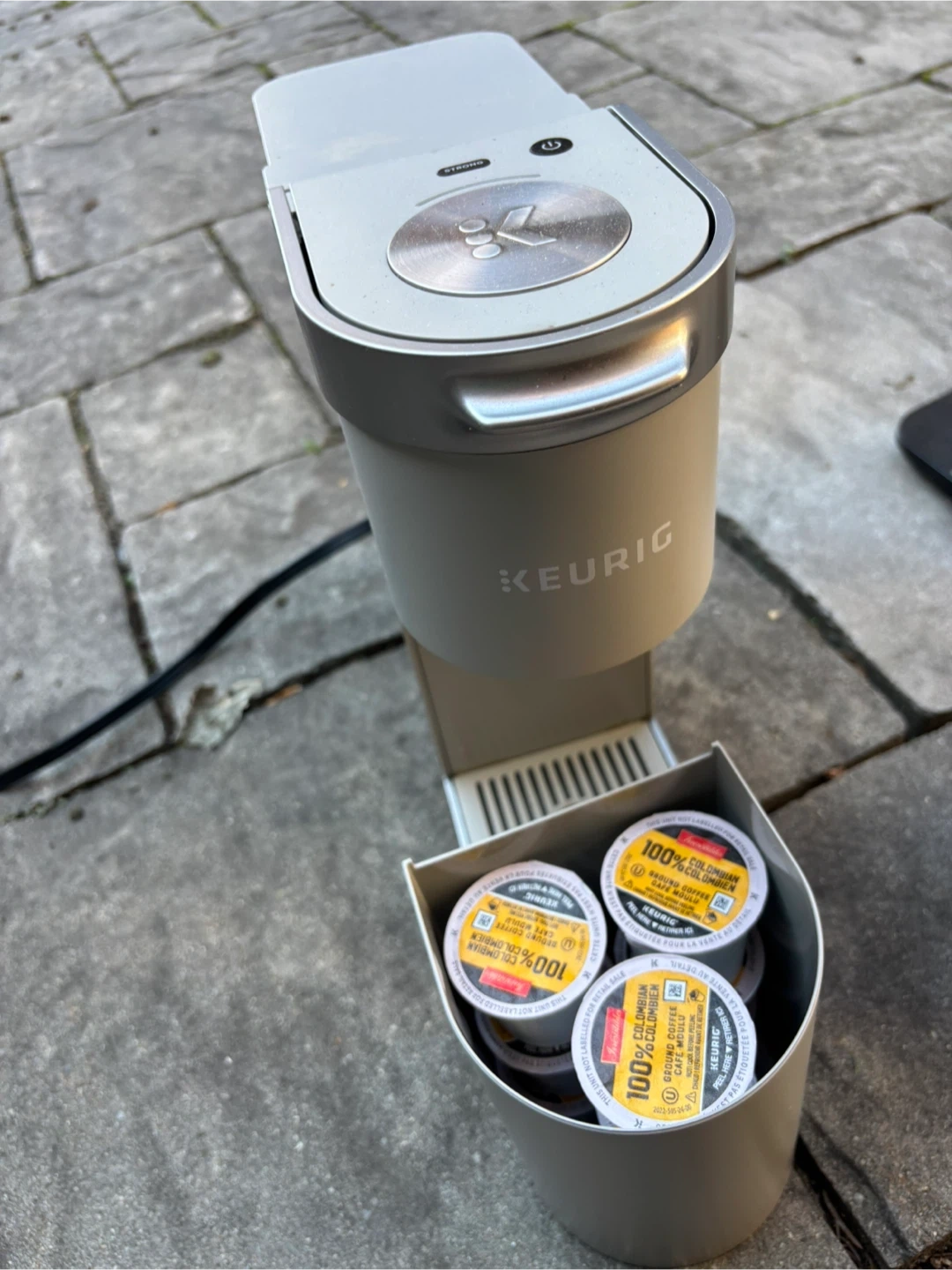 Selling a Keurig K-Mini coffee maker in grey. It's in great condition and perfect for small spaces. Bonus coffee pods. Brews a single cup at a time, so it's super convenient for a quick coffee fix