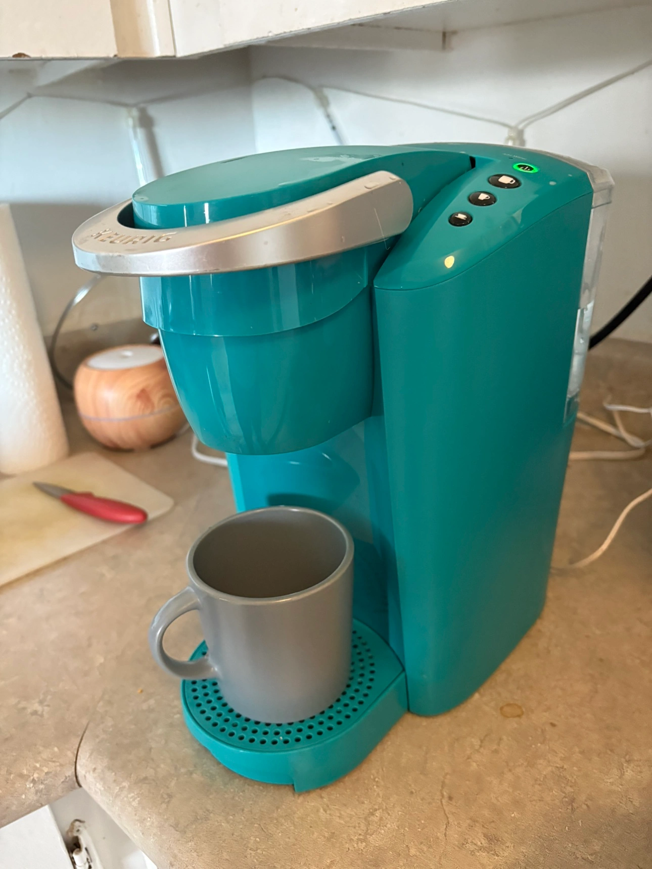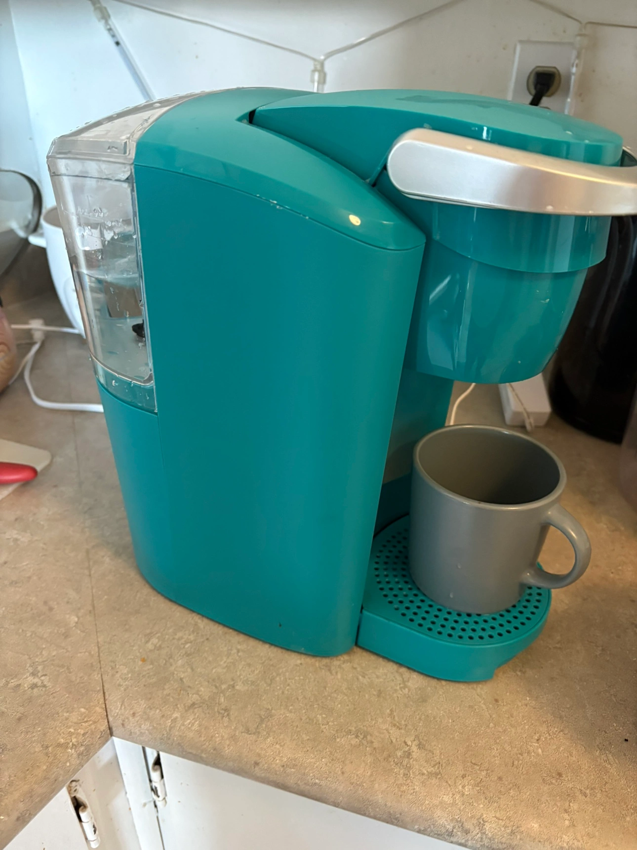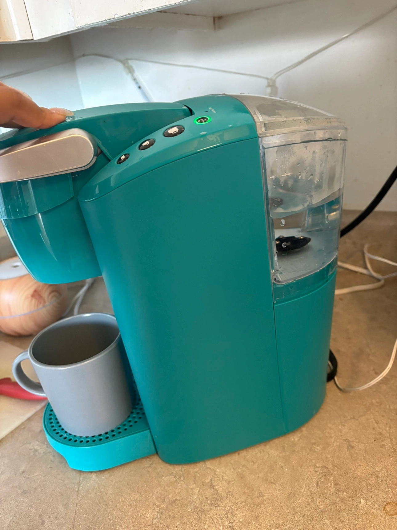 27Teal coloured K-Mini Plus Coffee Maker with a water tank and a removable drip tray. Includes a reusable filter.