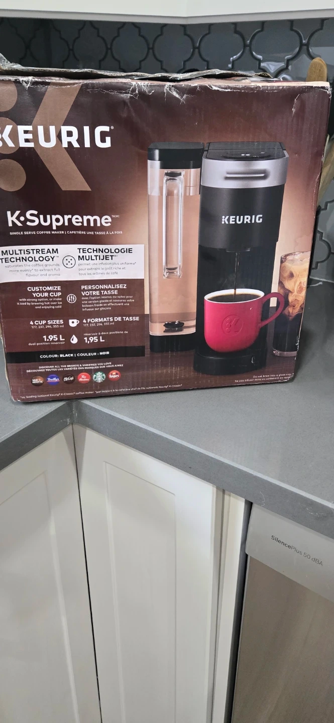 68Keurig K-Supreme single serve coffee maker! It uses multistream technology to evenly saturate the coffee grounds, extracting full flavour and aroma. It has multiple cup sizes and is black in colour. Comes with the original box!