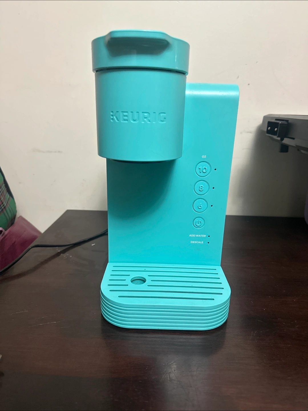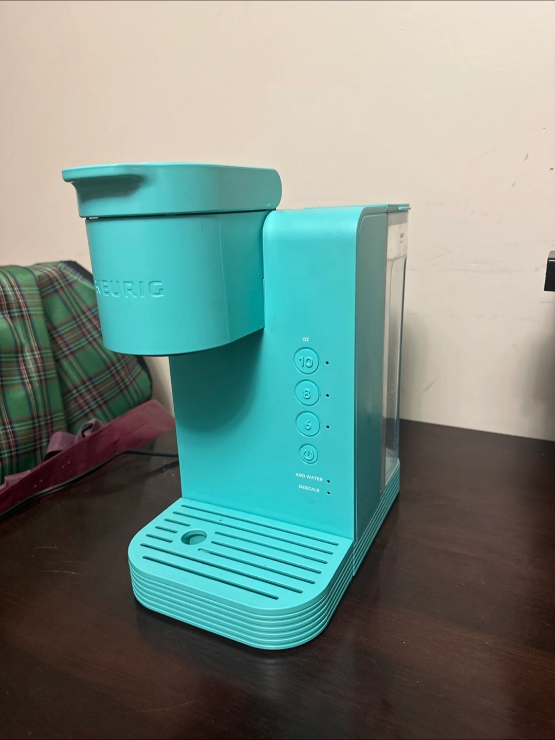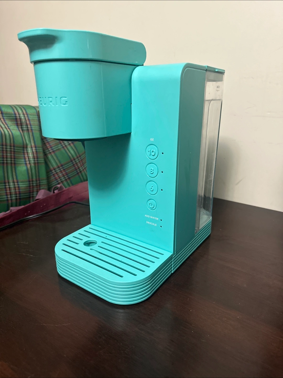 37Selling a Keurig single serve coffee maker in a lovely turquoise colour! It's perfect for making a quick cup of coffee in the morning. It has buttons for 6, 8, and 10 oz cups, plus add water and descale indicators. Great for small spaces!