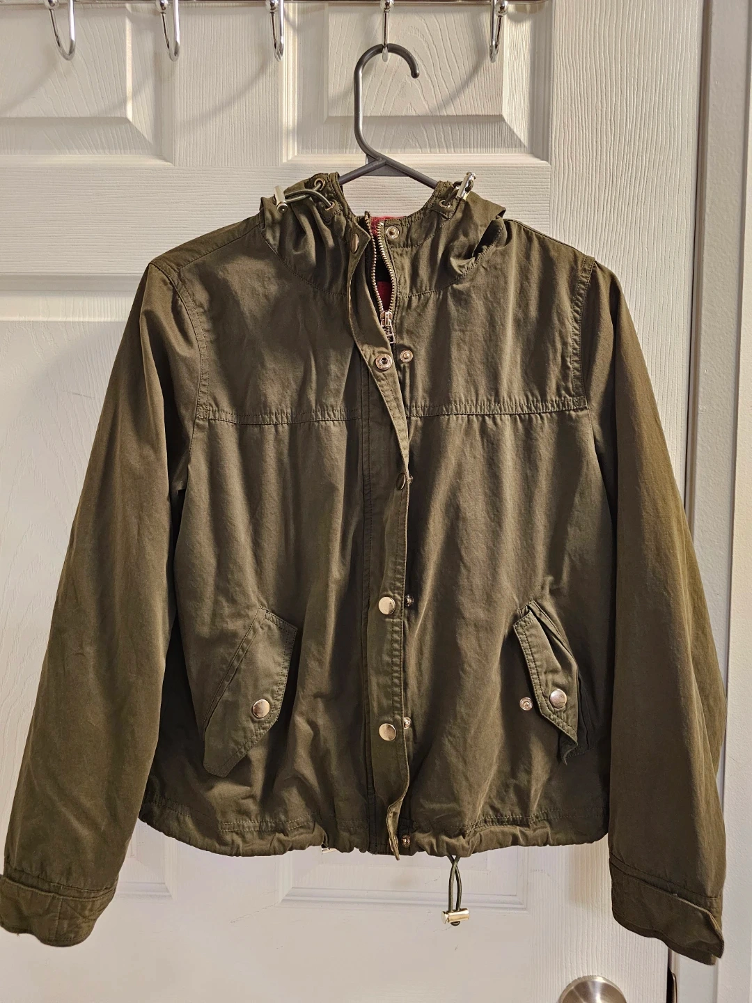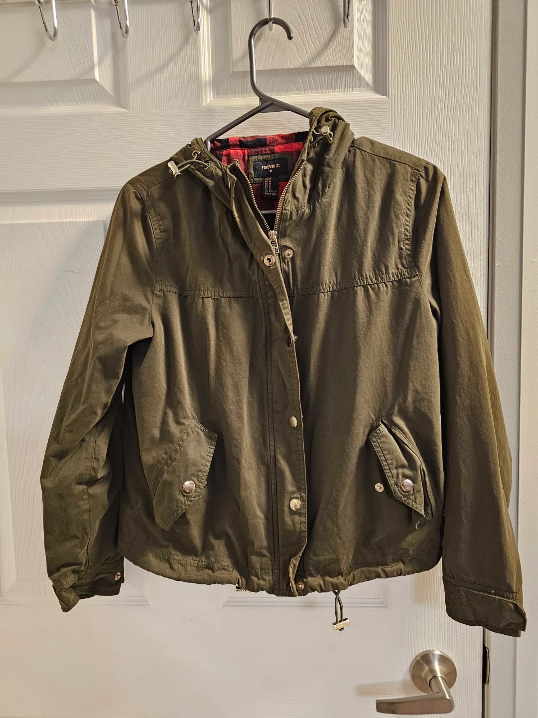 This olive green hooded jacket from Forever 21 features a cozy red and black plaid lining. It's perfect for cooler weather! Zipper and snap closure, with adjustable drawstring at the hem. Size m.
