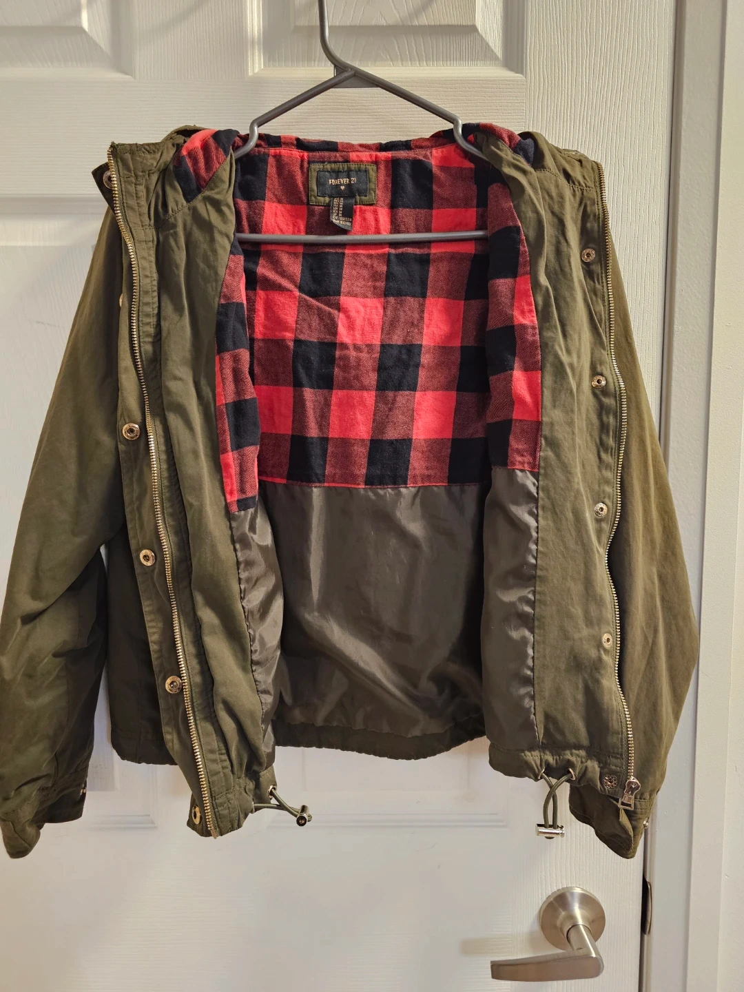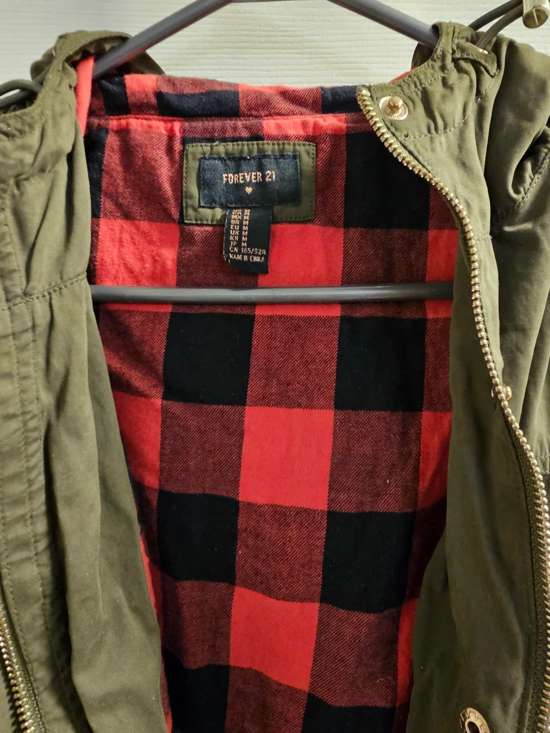 Forever 21 Olive Green Hooded Jacket with Red Plaid Lining