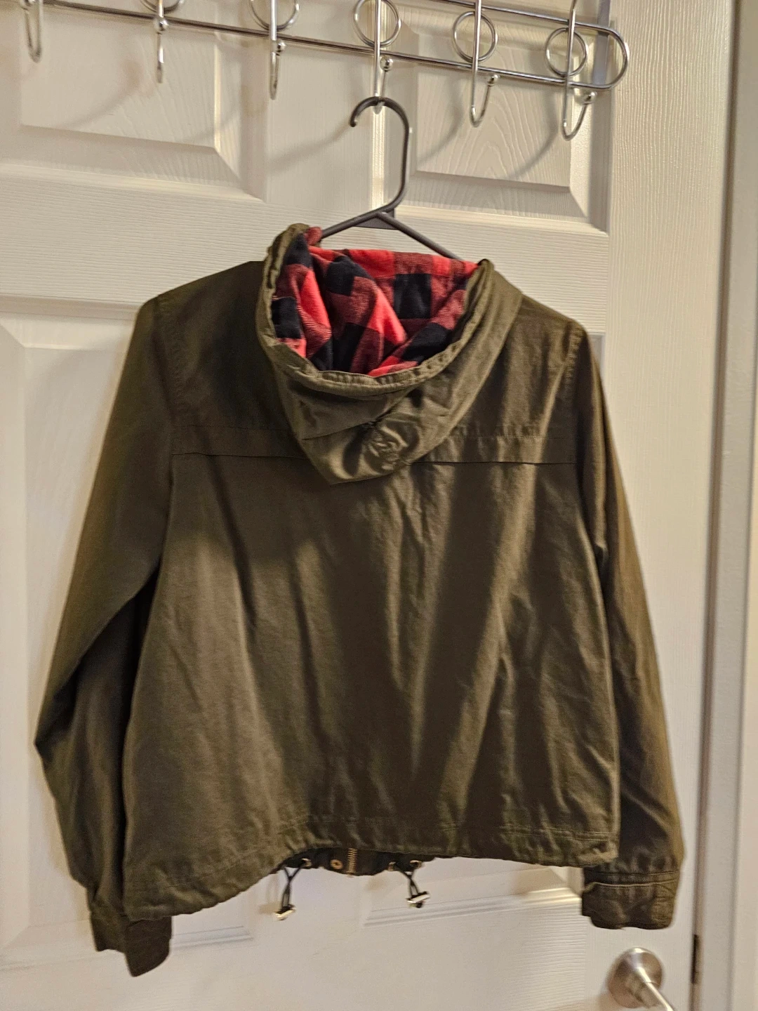 This olive green hooded jacket from Forever 21 features a cozy red and black plaid lining. It's perfect for cooler weather! Zipper and snap closure, with adjustable drawstring at the hem. Size m.