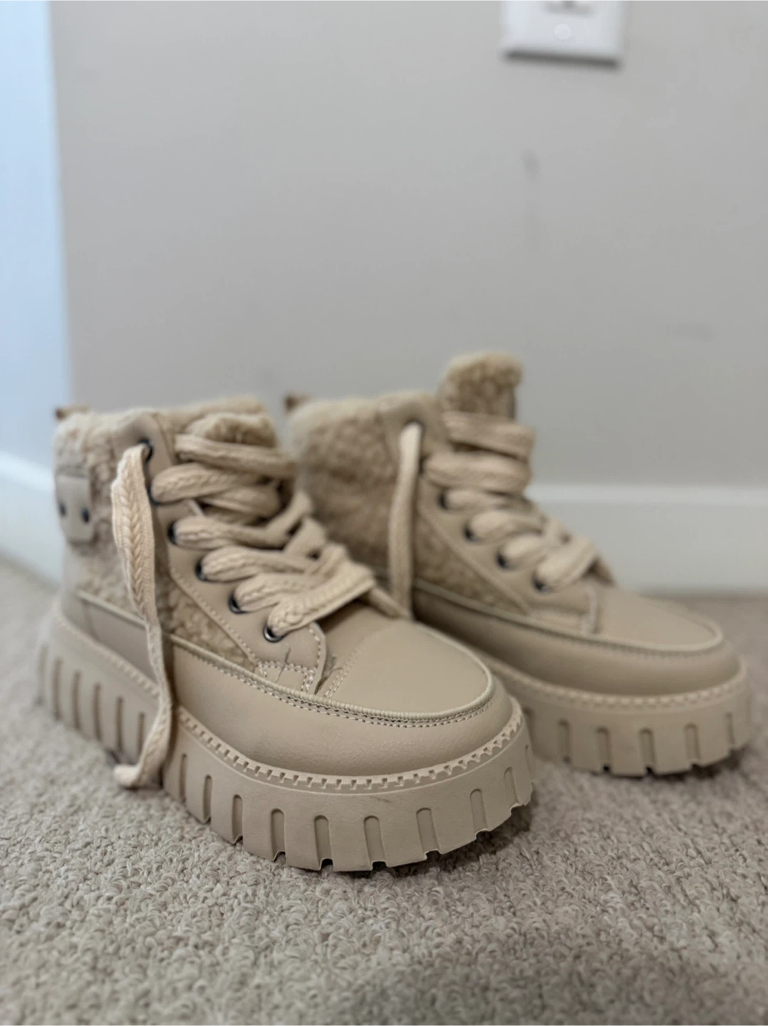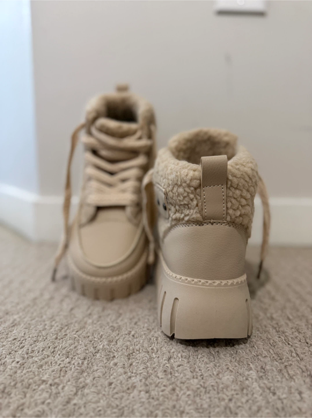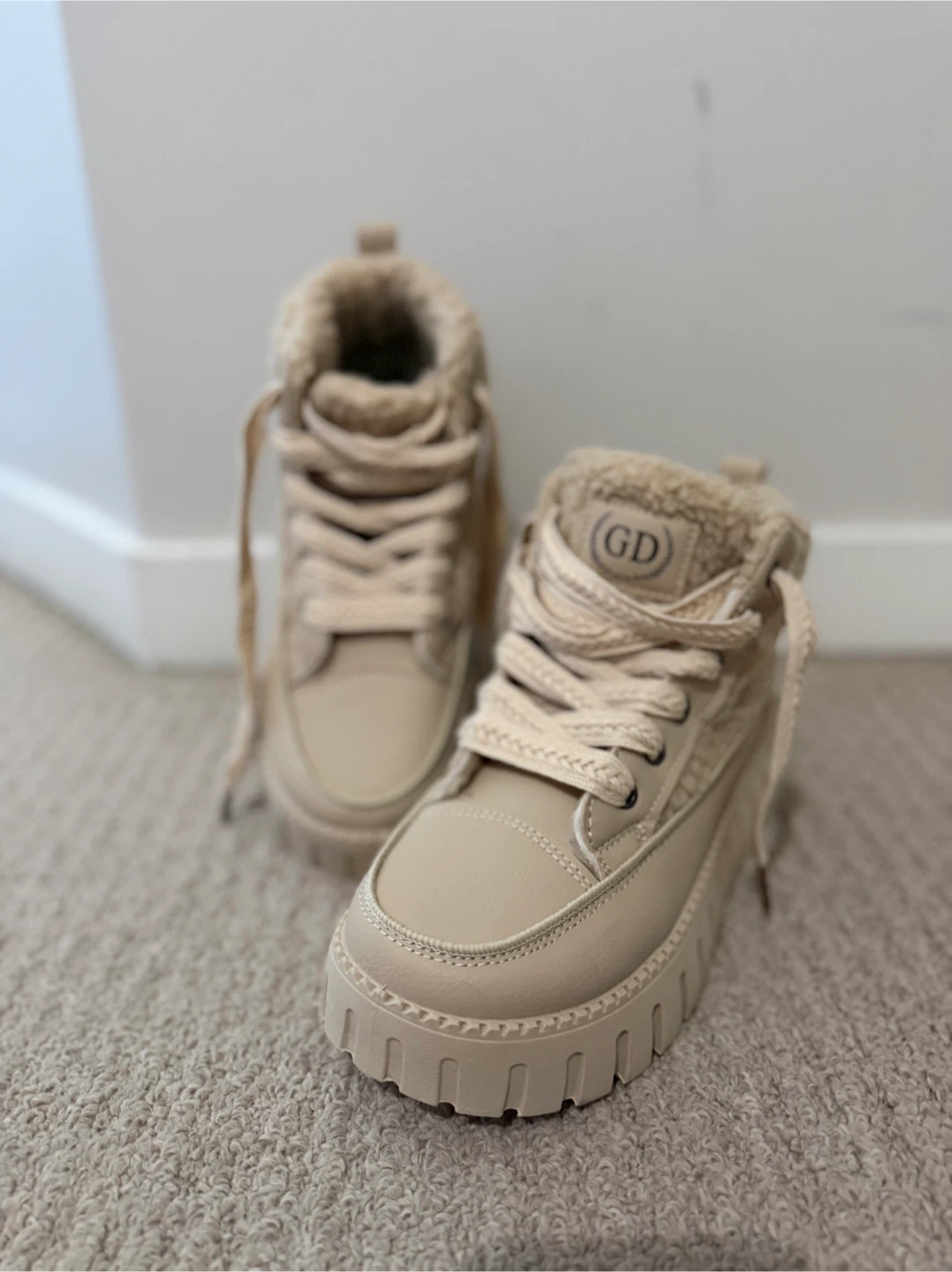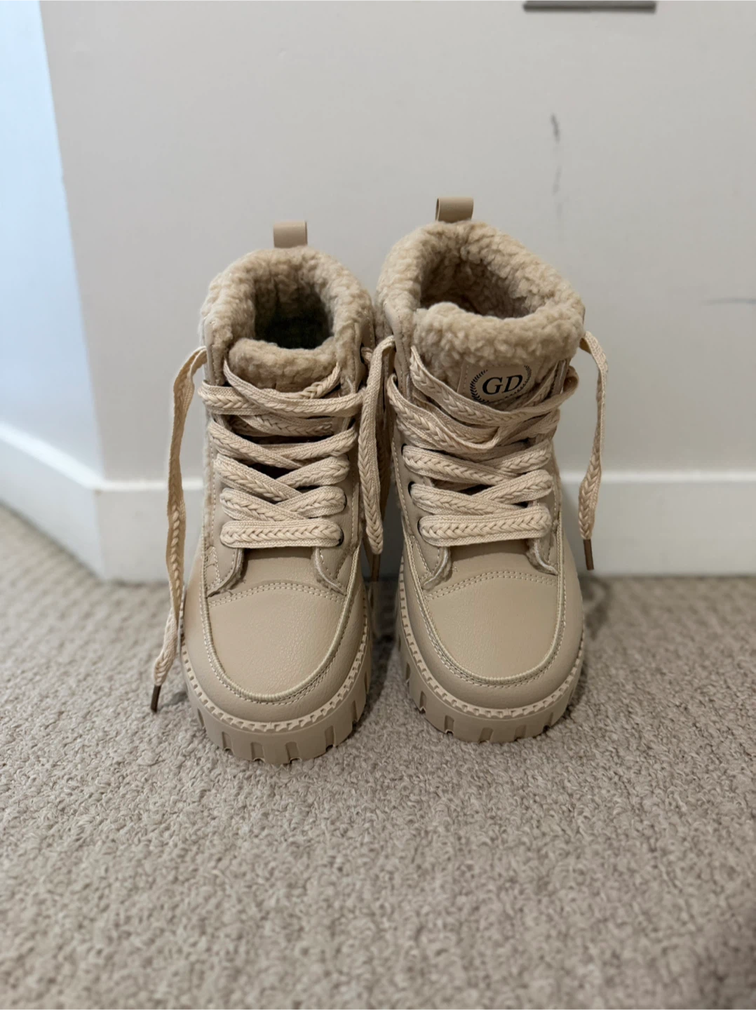 These GD boots are a stylish beige colour. They're lined with cozy sherpa for warmth. The chunky sole provides good grip. Perfect for keeping your feet toasty when it's chilly out!