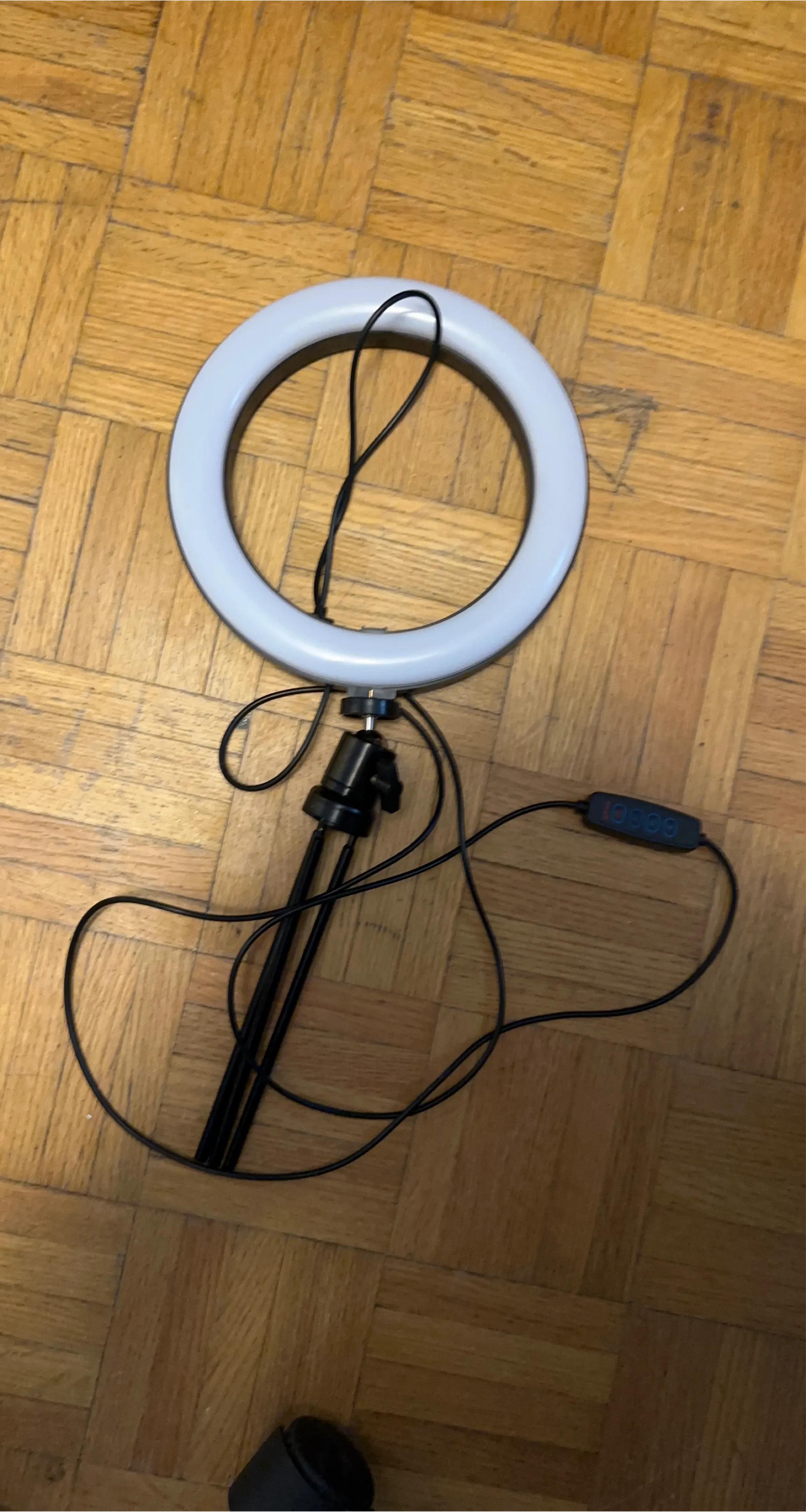 This is a white ring light with a black tripod. It includes an inline controller for adjustments. It's ideal for content creators or anyone needing good lighting.