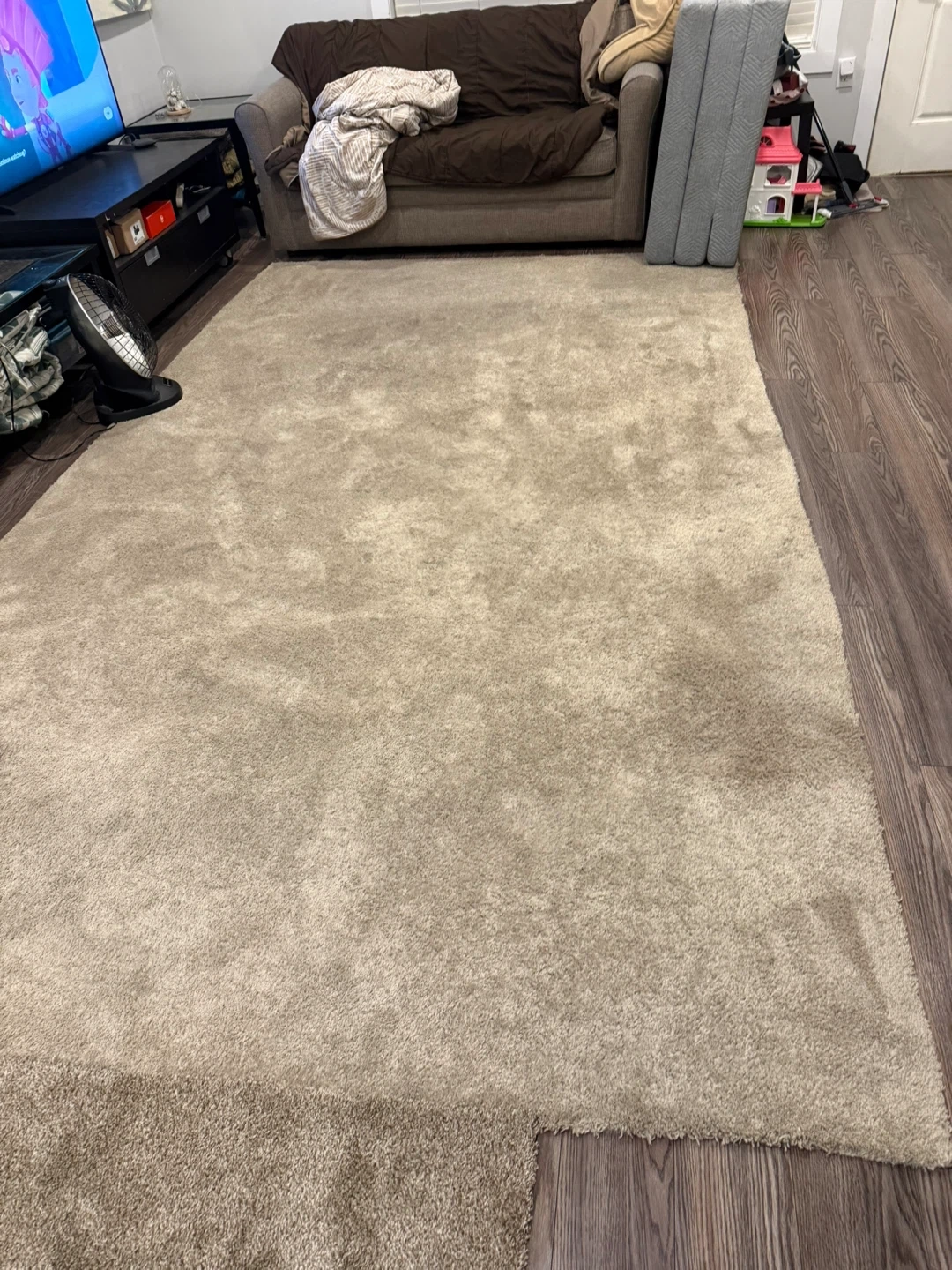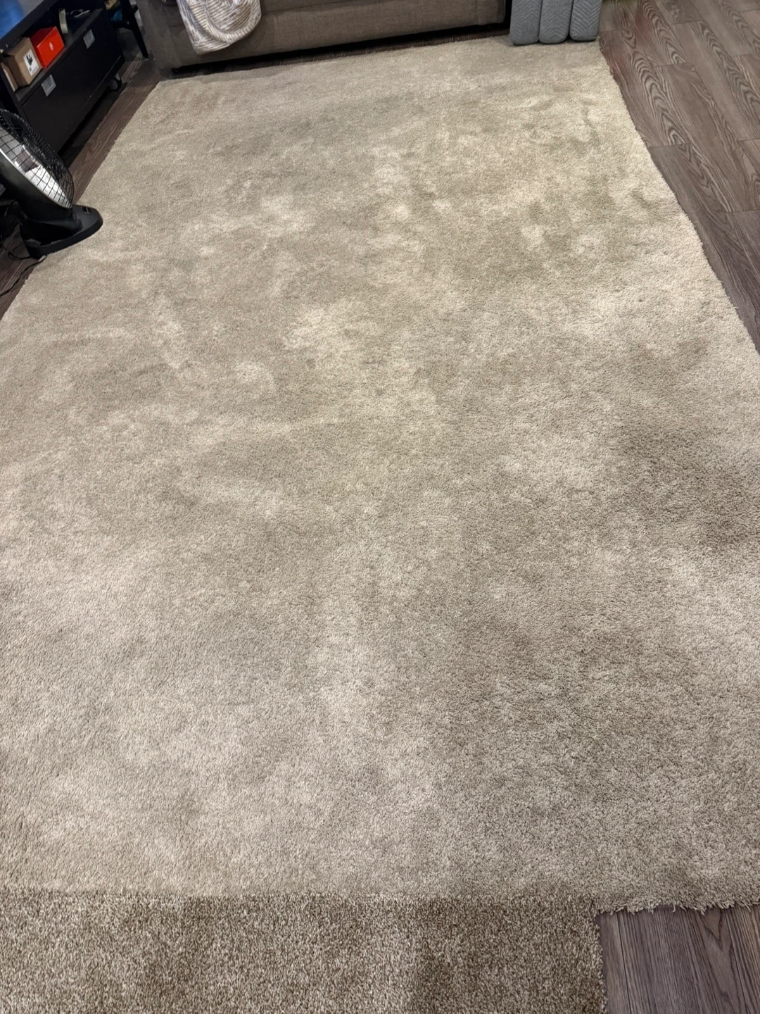 A large, soft shaggy area rug perfect for any living room or bedroom. Its neutral beige colour complements most decor styles. It's plush and cozy underfoot!