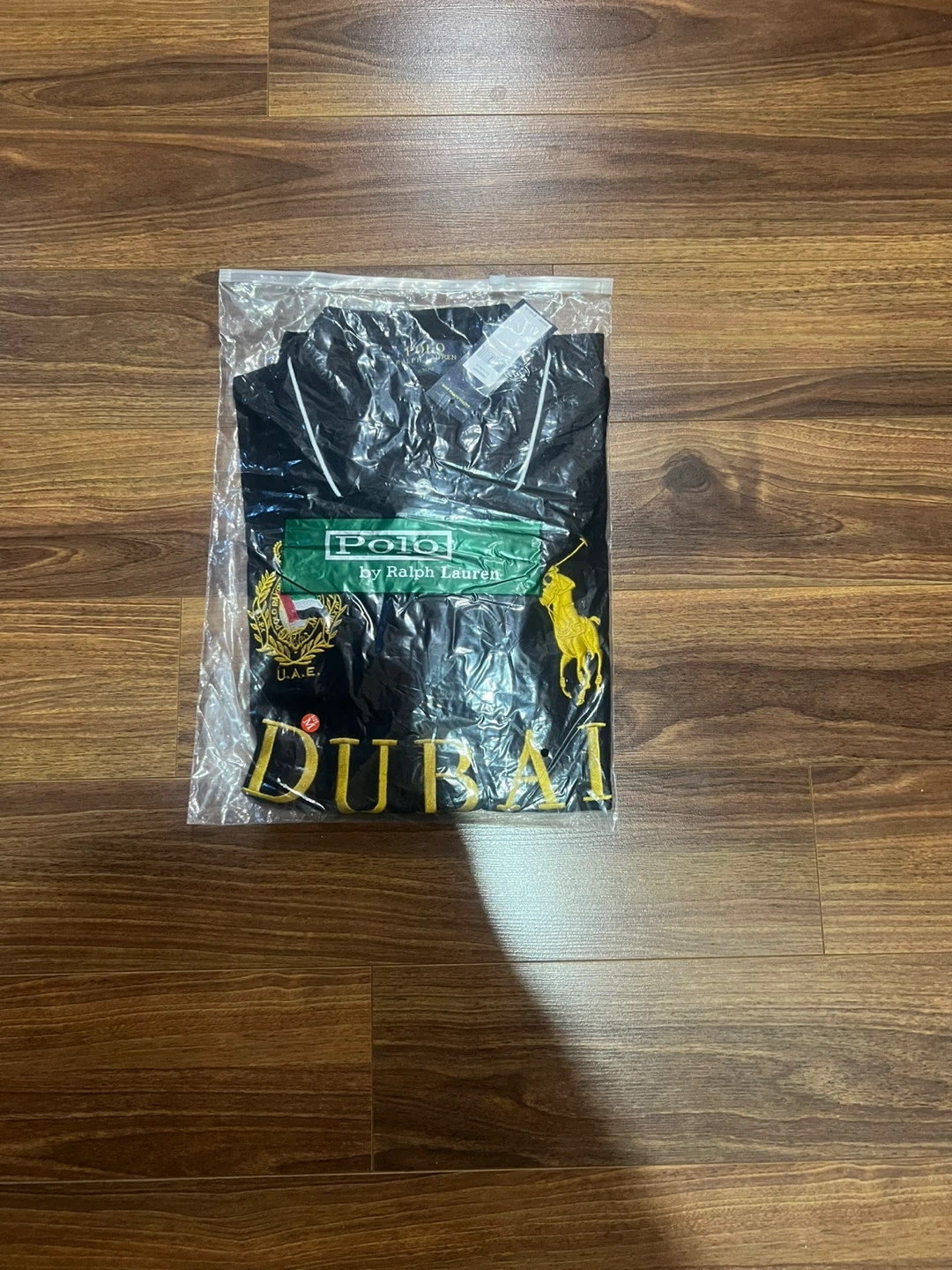 This black Polo Ralph Lauren polo shirt features "DUBAI" embroidered on the front with the classic Ralph Lauren polo player logo. It's a short-sleeved style with a collar and button closure. The shirt comes in a plastic protective bag.