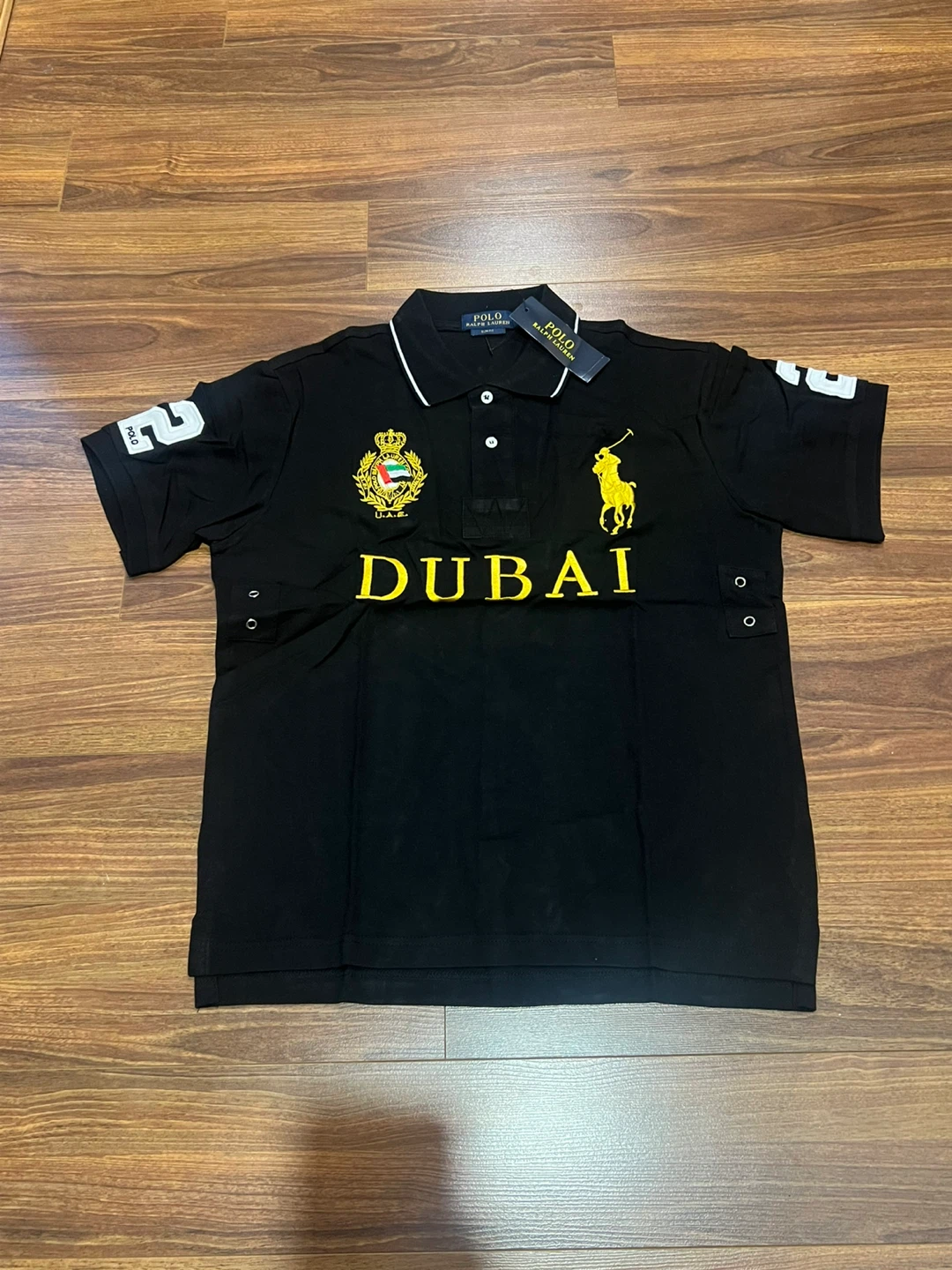 This black Polo Ralph Lauren polo shirt features "DUBAI" embroidered on the front with the classic Ralph Lauren polo player logo. It's a short-sleeved style with a collar and button closure. The shirt comes in a plastic protective bag.