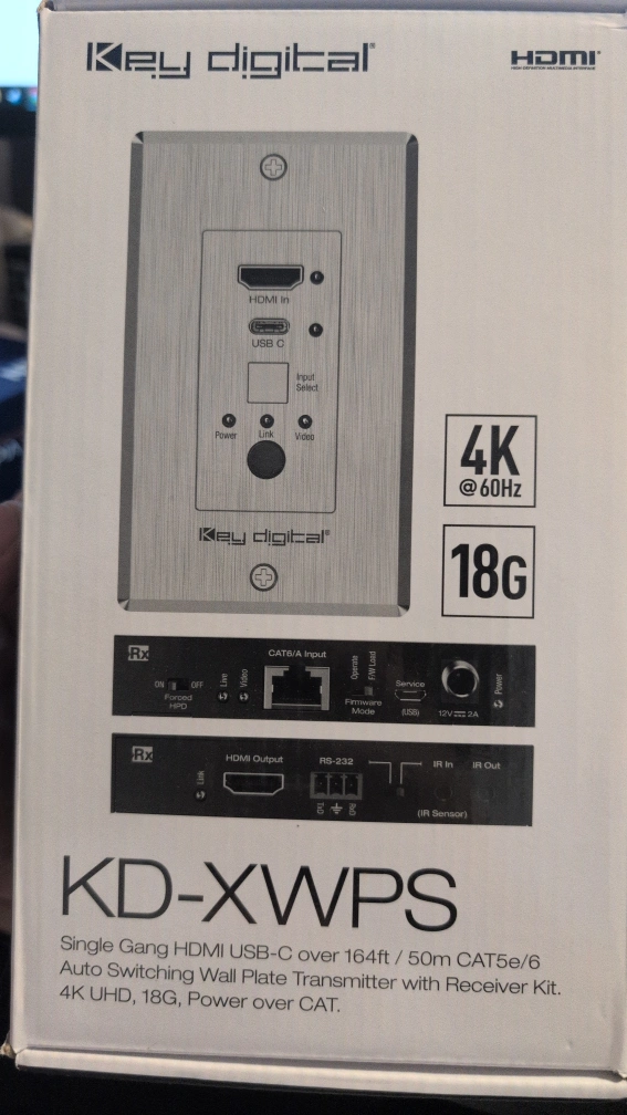 Single gang wall plate transmitter with receiver. Supports HDMI, USB-C, and CAT5e/6. 4K UHD, 18Gbps, power over CAT. Includes all necessary components.
