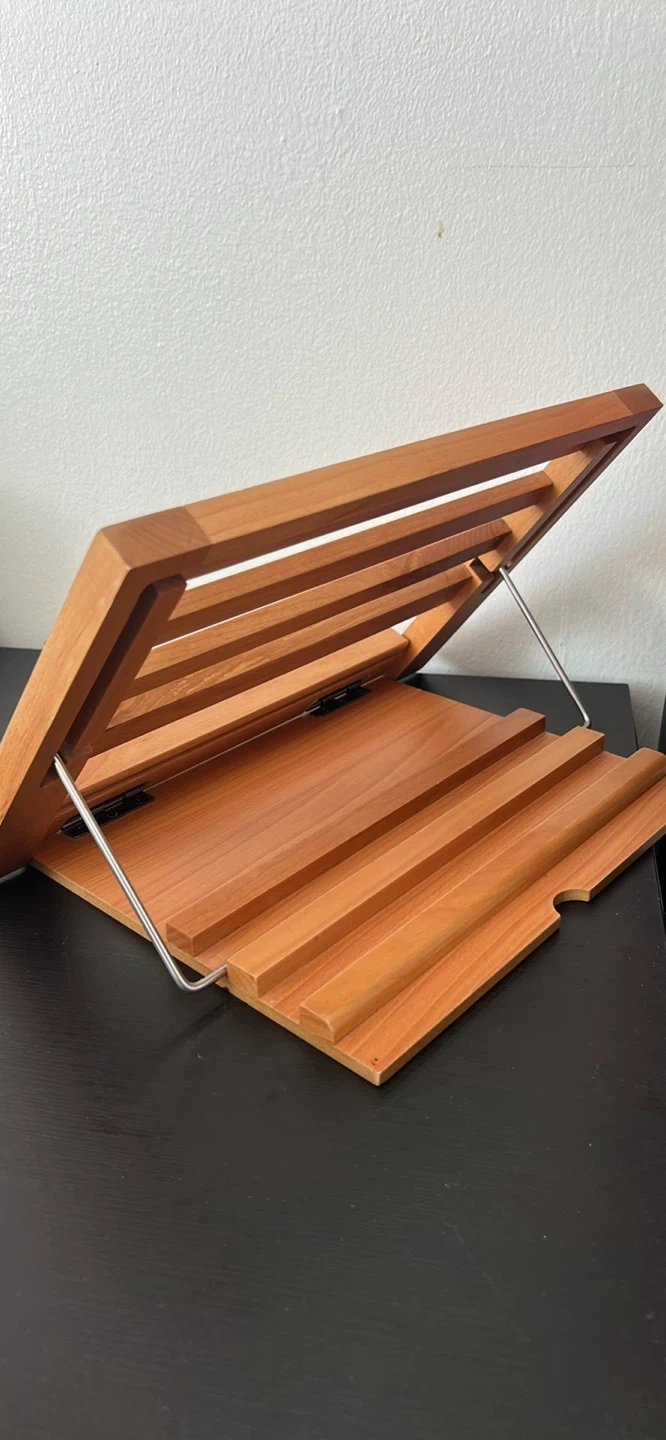 This wooden stand is perfect for holding cookbooks or recipes while you're cooking. It's made of wood and has a natural finish. The stand is adjustable for different viewing angles.