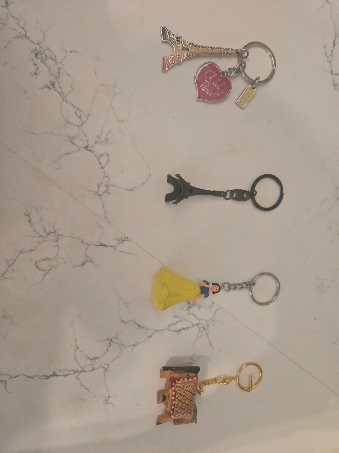 23Selling a collection of keychains! There's one of the Eiffel Tower with a cute 'Oh la la! Paris!' charm, a Snow White keychain, and a wooden horse keychain. Each keychain is $5