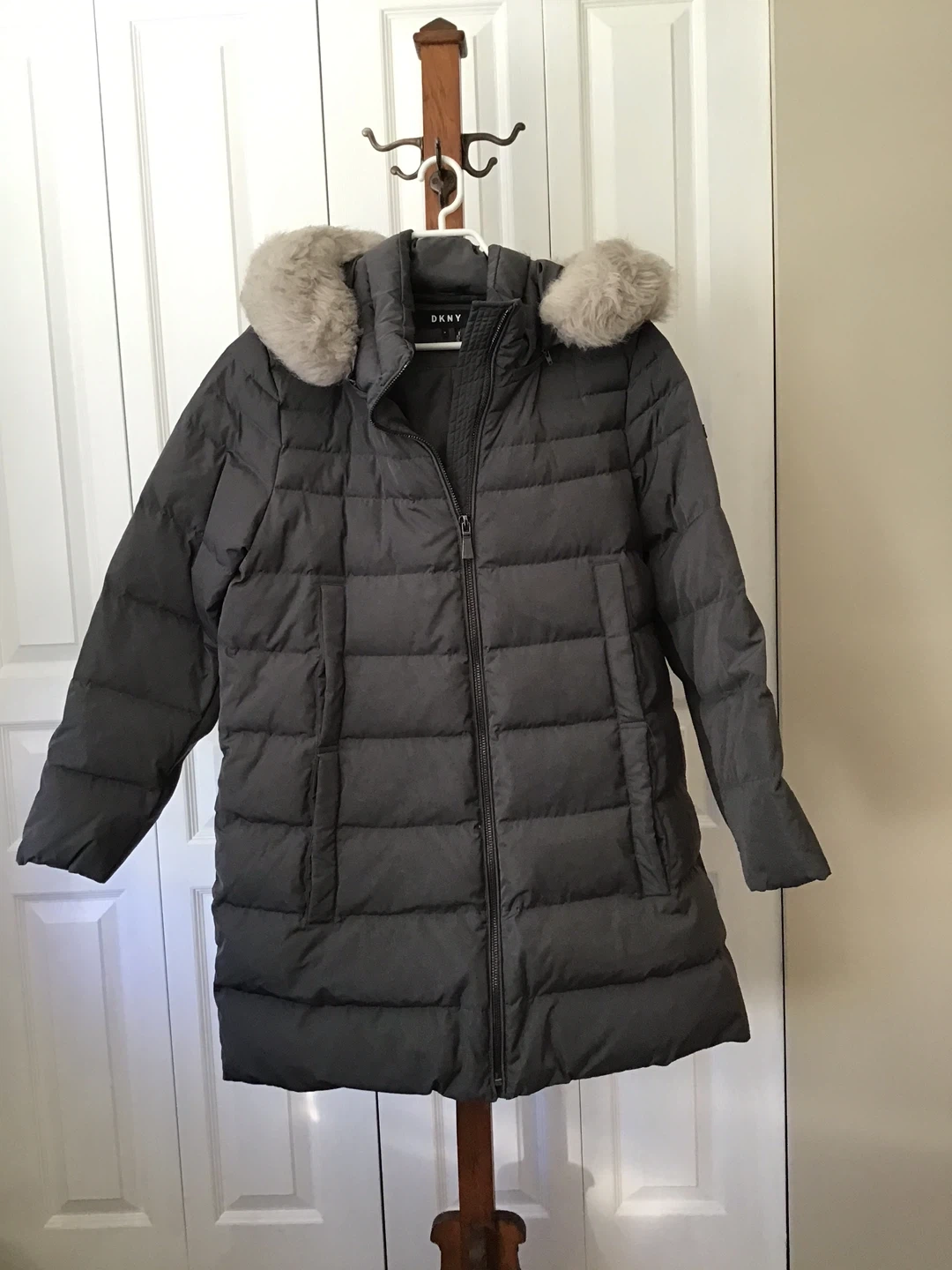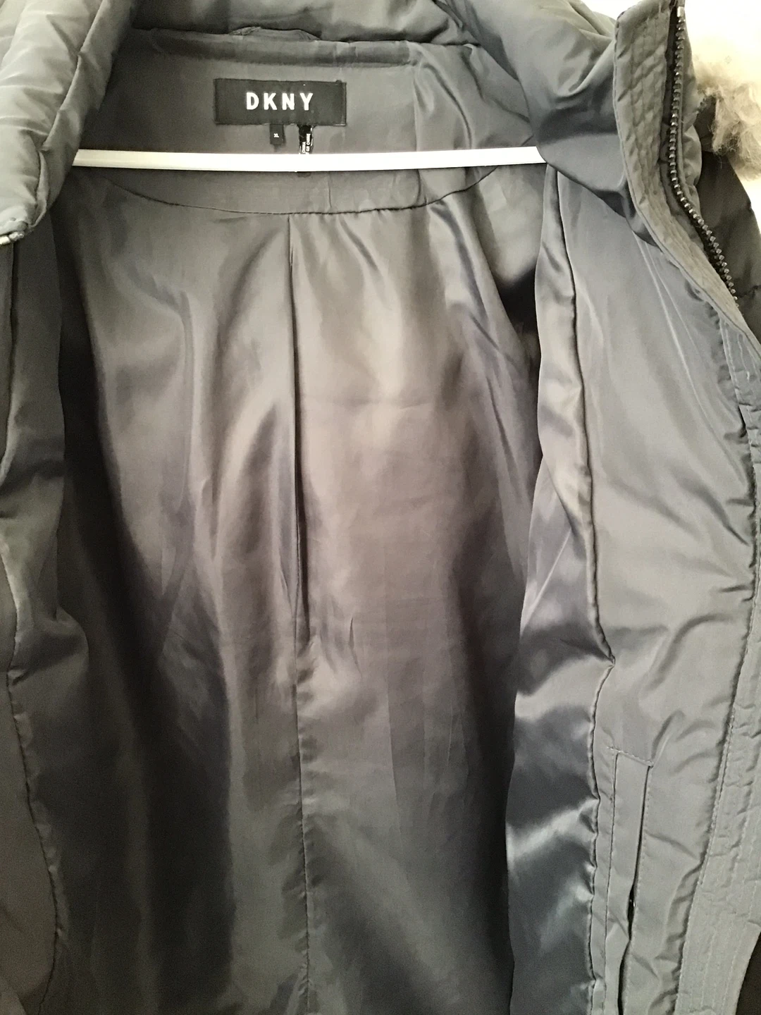 Selling a DKNY puffer coat in size XL. It's a stylish grey colour and features a faux fur hood trim. Perfect for staying warm this winter!