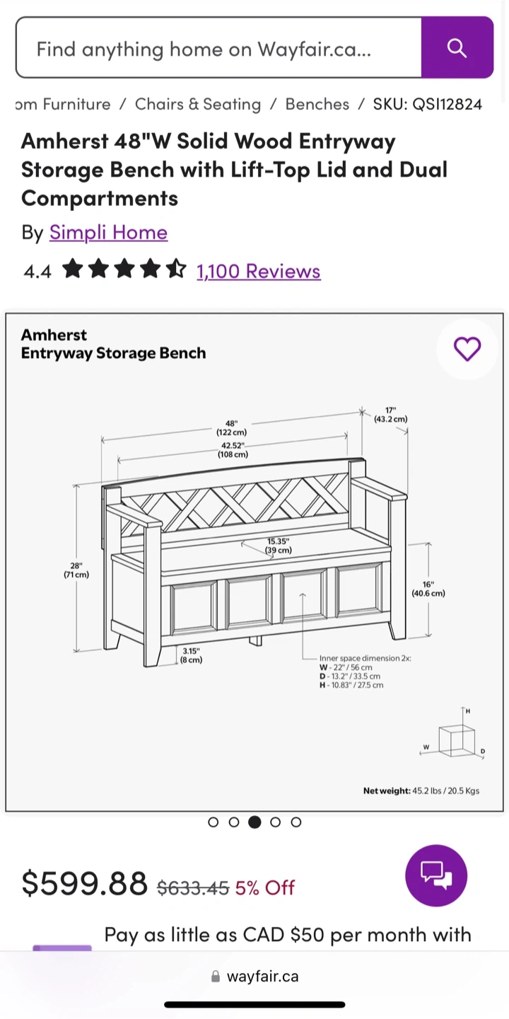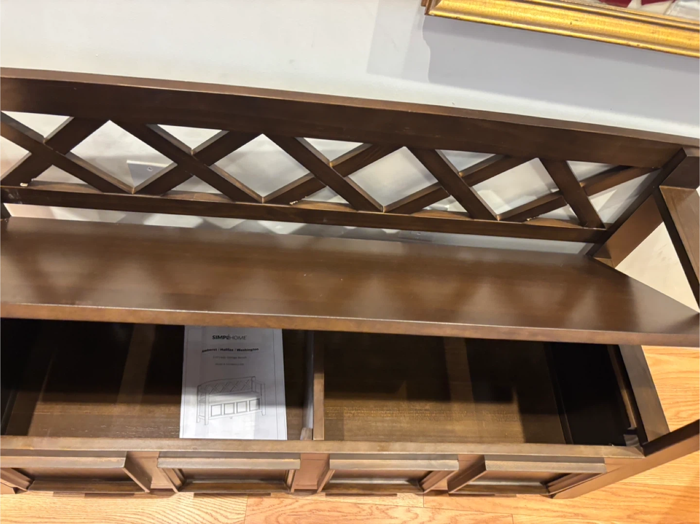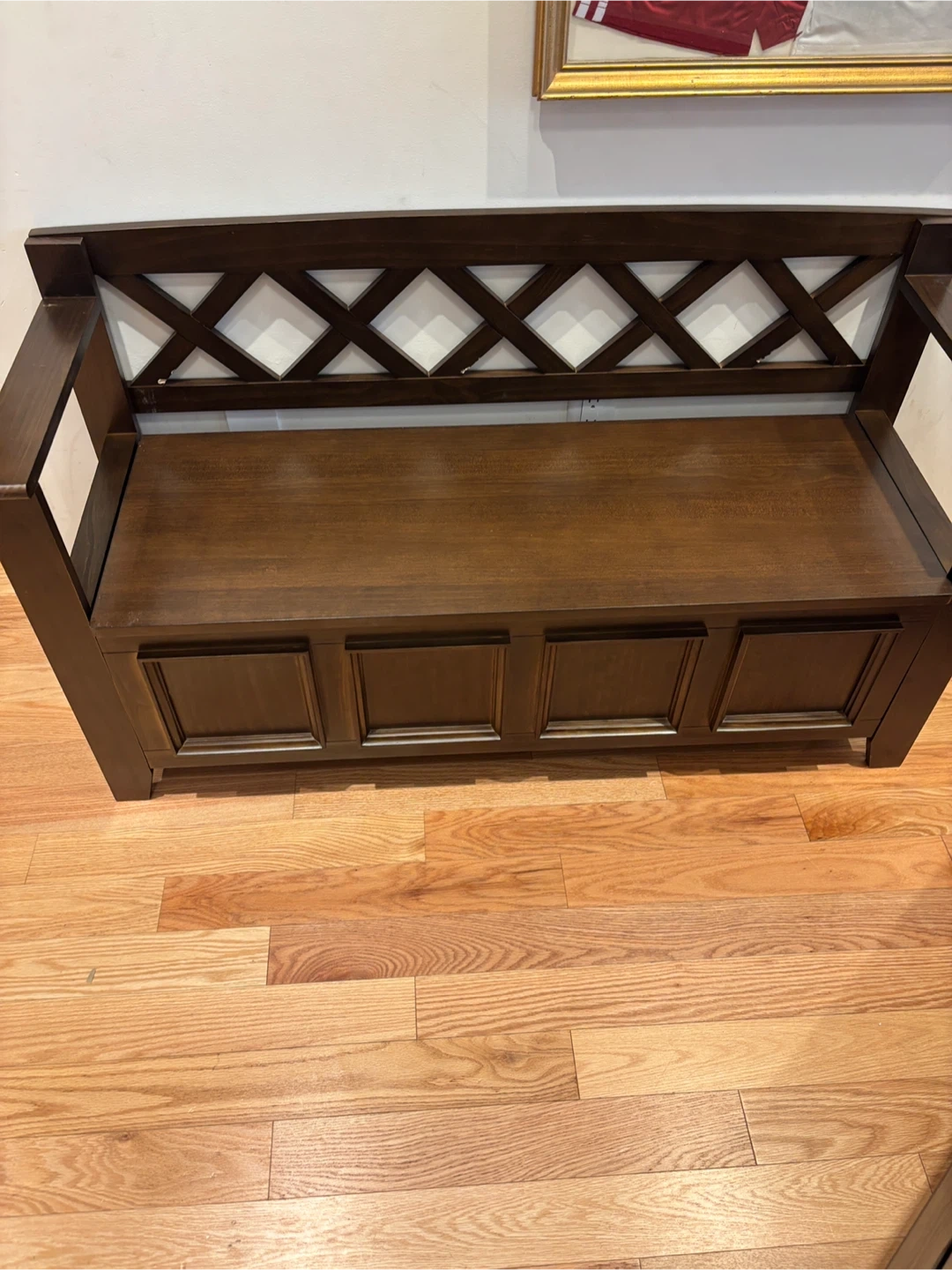 This wooden storage bench features a lift-top lid and dual compartments for ample storage. It's crafted from solid wood with a rich brown finish. The lattice back design adds a stylish touch to any entryway or mudroom.its new. Gotten from an auction site . Had a little chip during assembly.