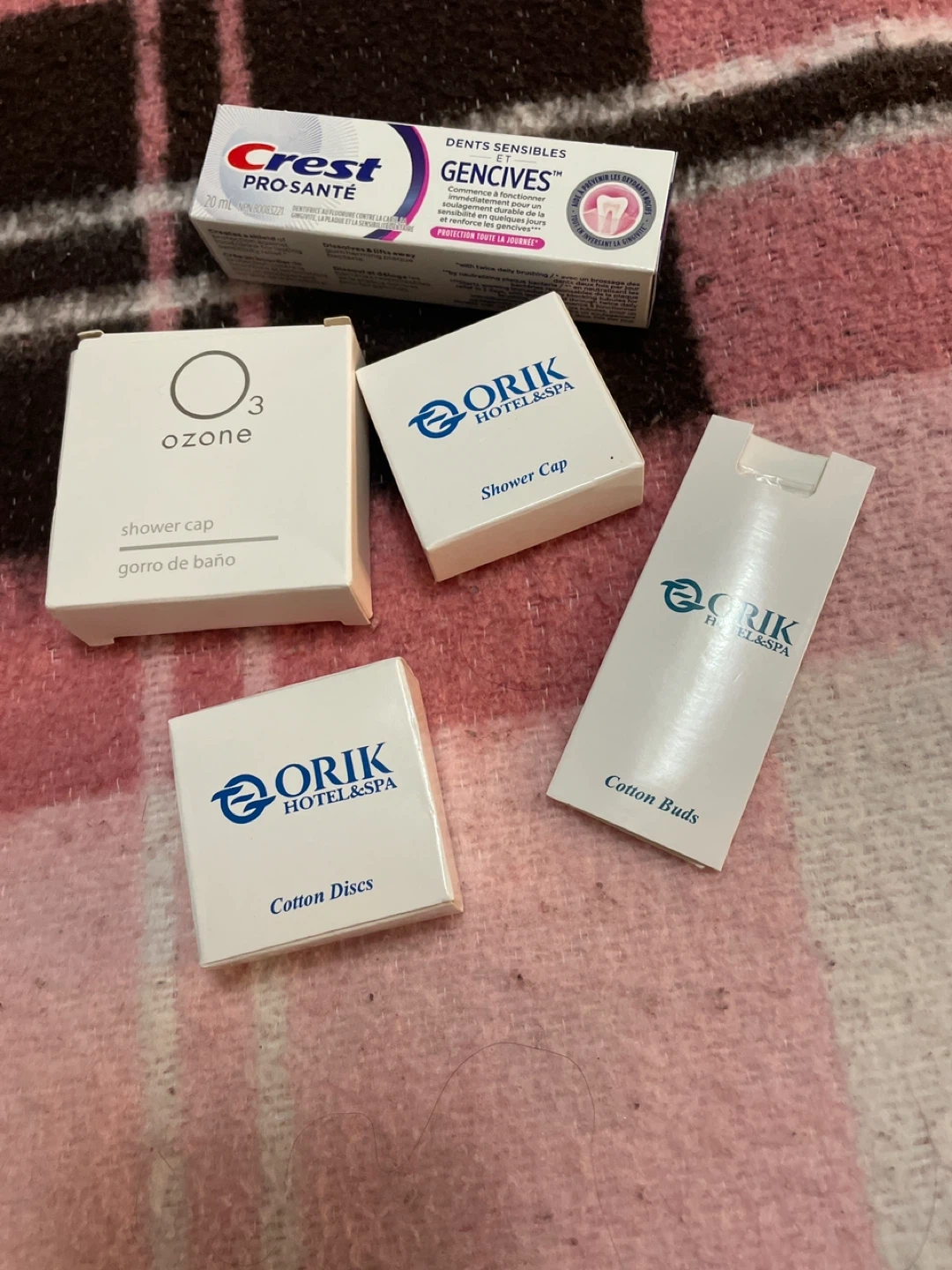 This is a collection of travel-sized toiletries including Shampoo, conditioner, intimate wash, shower cap, cotton buds, and cotton discs. It also includes a set of combs, a multi-action toothbrush, facial soap, and Crest Pro-Santé toothpaste. This bundle is perfect for travel or a guest amenity kit!