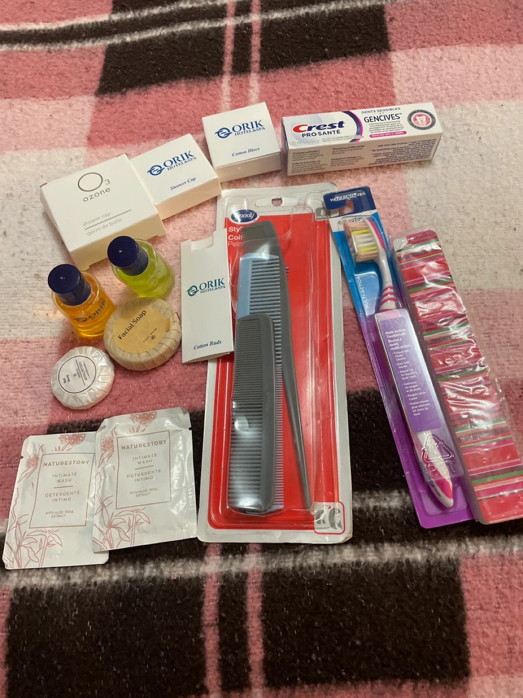 This is a collection of travel-sized toiletries including Shampoo, conditioner, intimate wash, shower cap, cotton buds, and cotton discs. It also includes a set of combs, a multi-action toothbrush, facial soap, and Crest Pro-Santé toothpaste. This bundle is perfect for travel or a guest amenity kit!