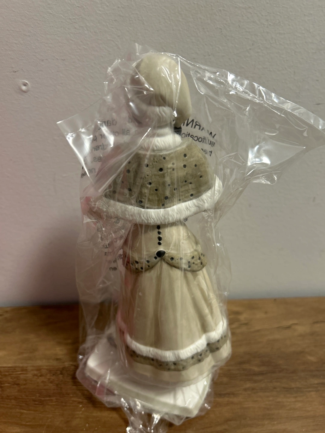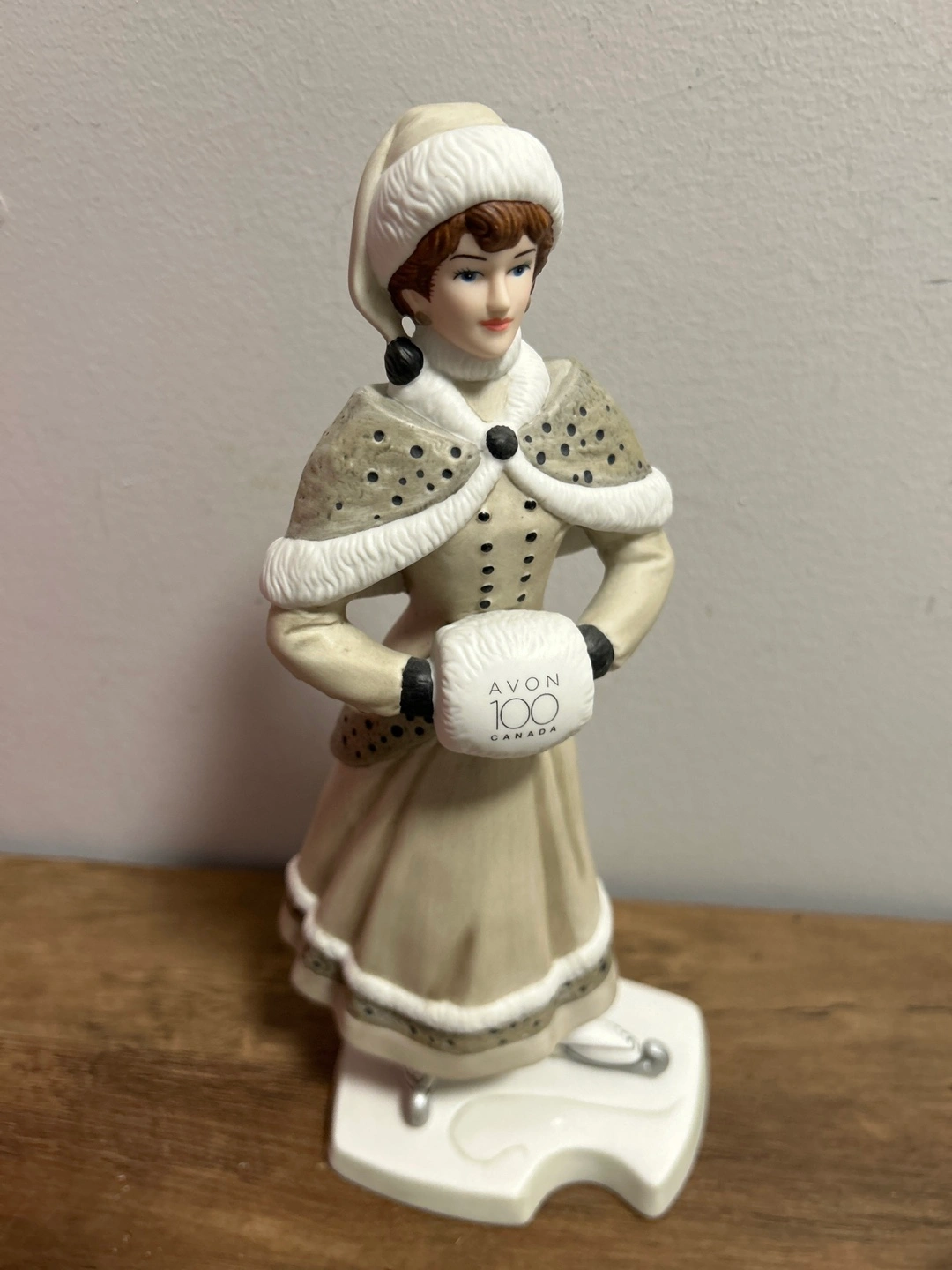 This is an Avon President's Recognition Award figurine from the 2014-2015 year. It commemorates Avon Canada's 100th anniversary. The figurine depicts a woman in winter attire, holding a muff with 'Avon 100 Canada' printed on it.