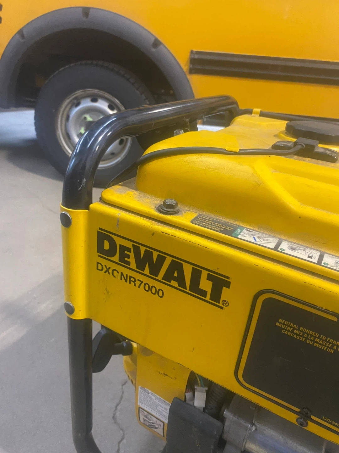 DeWalt DXCNR7000 generator. Yellow and black colour. Features neutral bonded to frame. Gas powered not diesel.