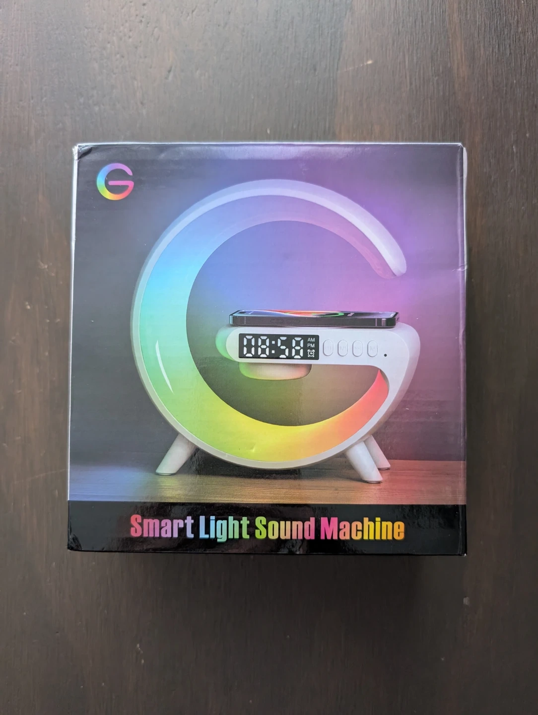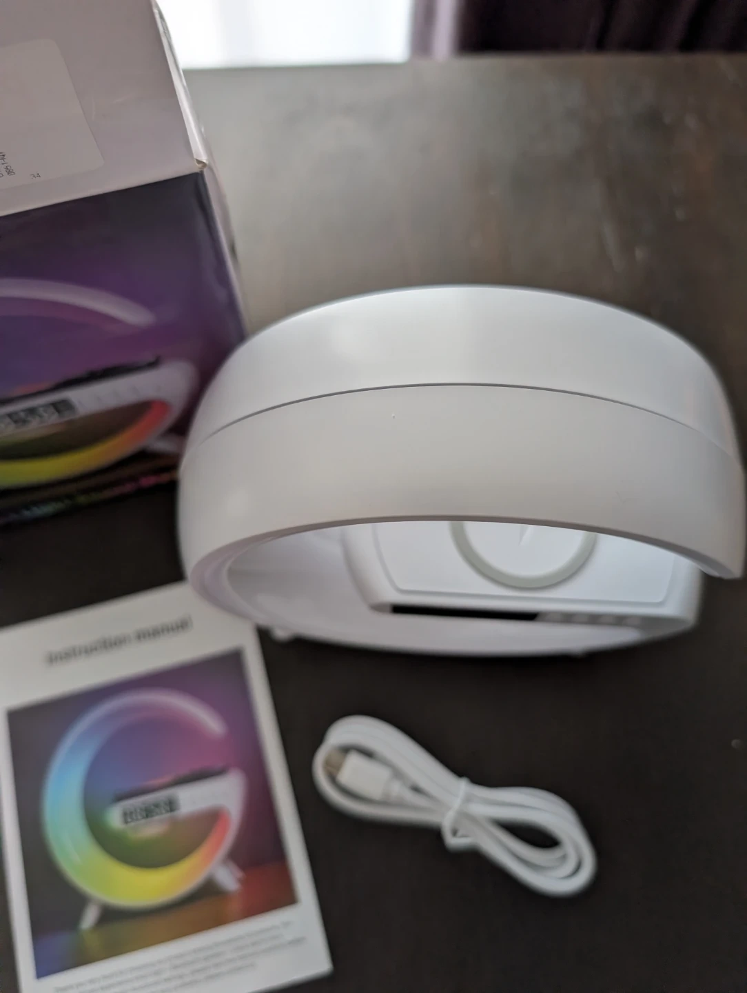 This smart light sound machine features a unique C-shaped design that mimics a sunrise and has a built-in wireless charger. It also includes an instruction manual and USB cable. It's great for creating a relaxing atmosphere or as a bedside alarm clock.