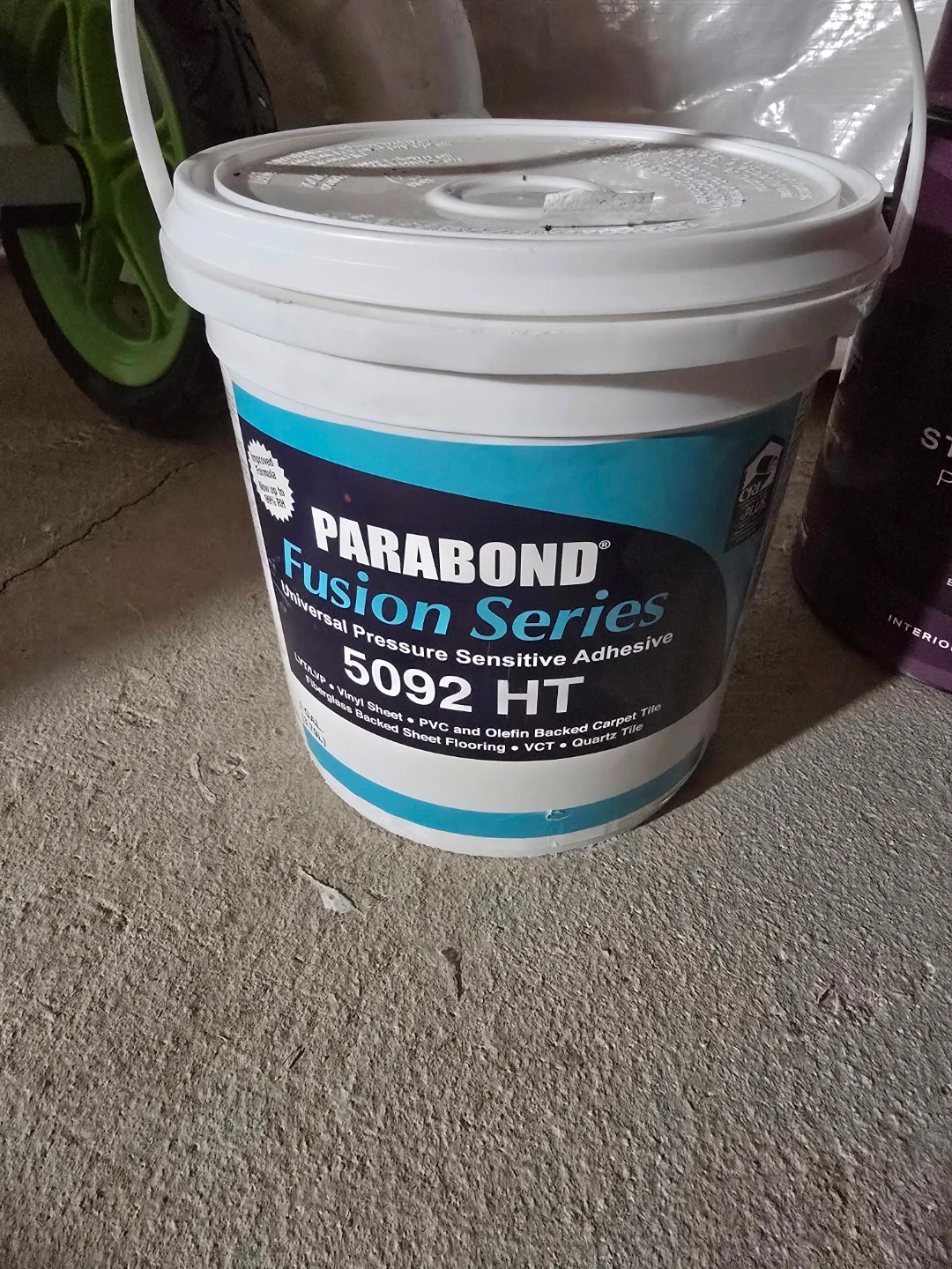 This is PARABOND Fusion Series 5092 HT, a universal pressure-sensitive adhesive. It's suitable for LVT/LVP, vinyl sheet, PVC, olefin-backed carpet tile, fiberglass-backed sheet flooring, VCT, and quartz tile.