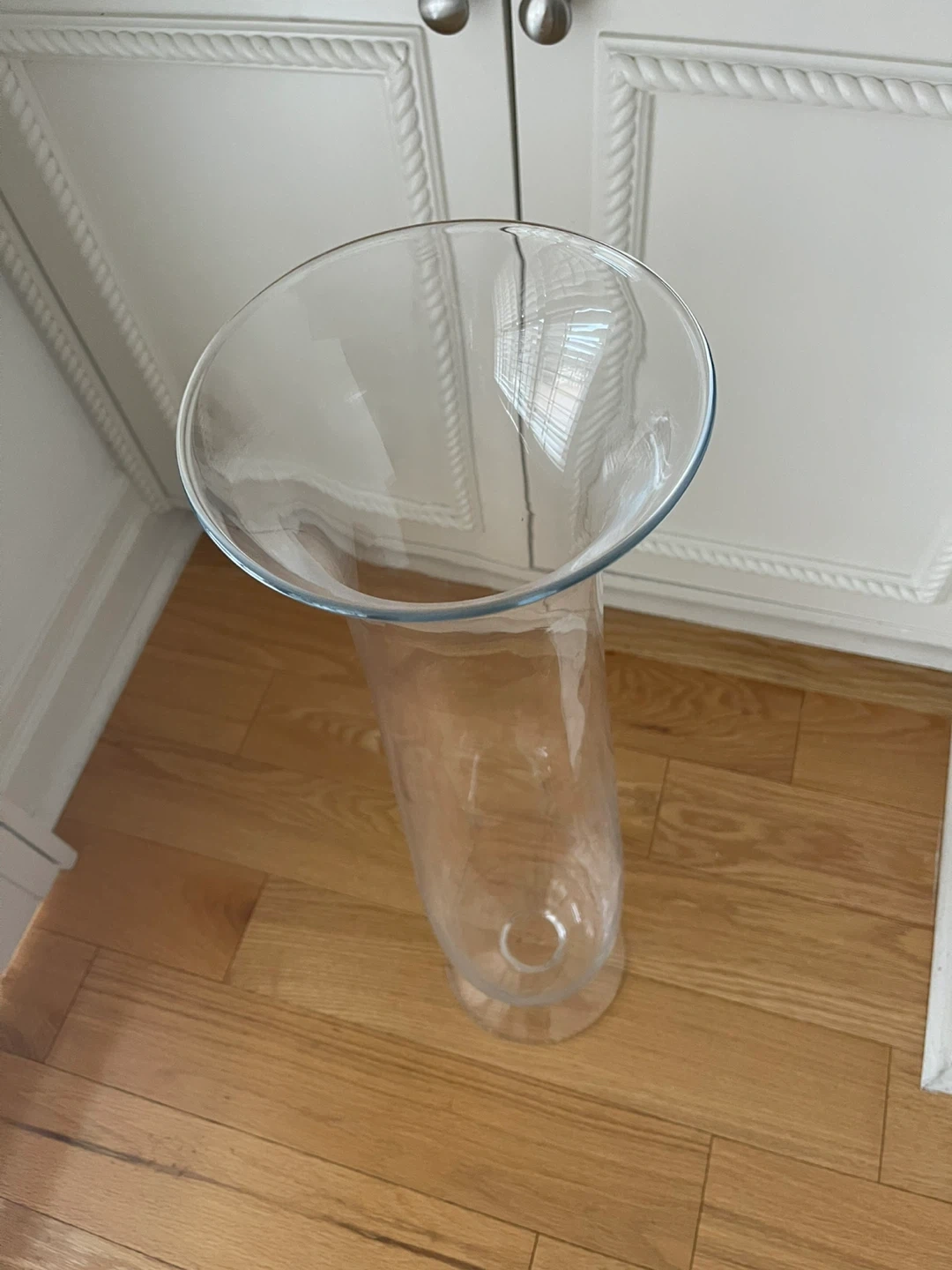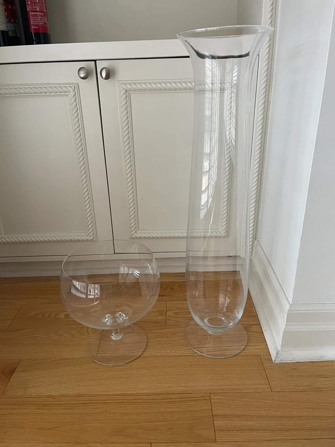 Two tall clear glass vases/vessels.One trumpet-shaped and one wide bowl-shaped vase. Perfect for displaying large floral arrangements, bathrooms, hallways, dinning rooms etc