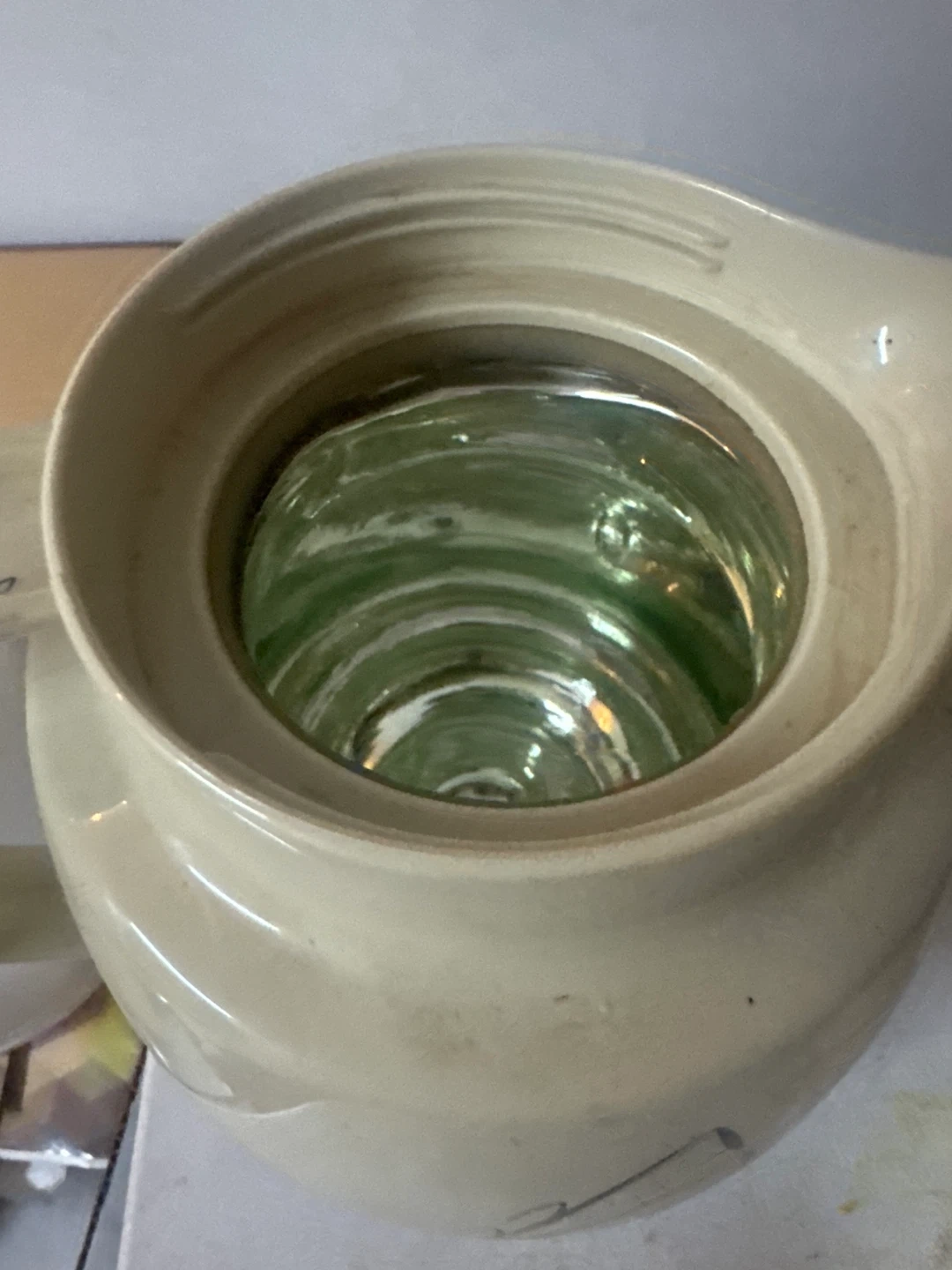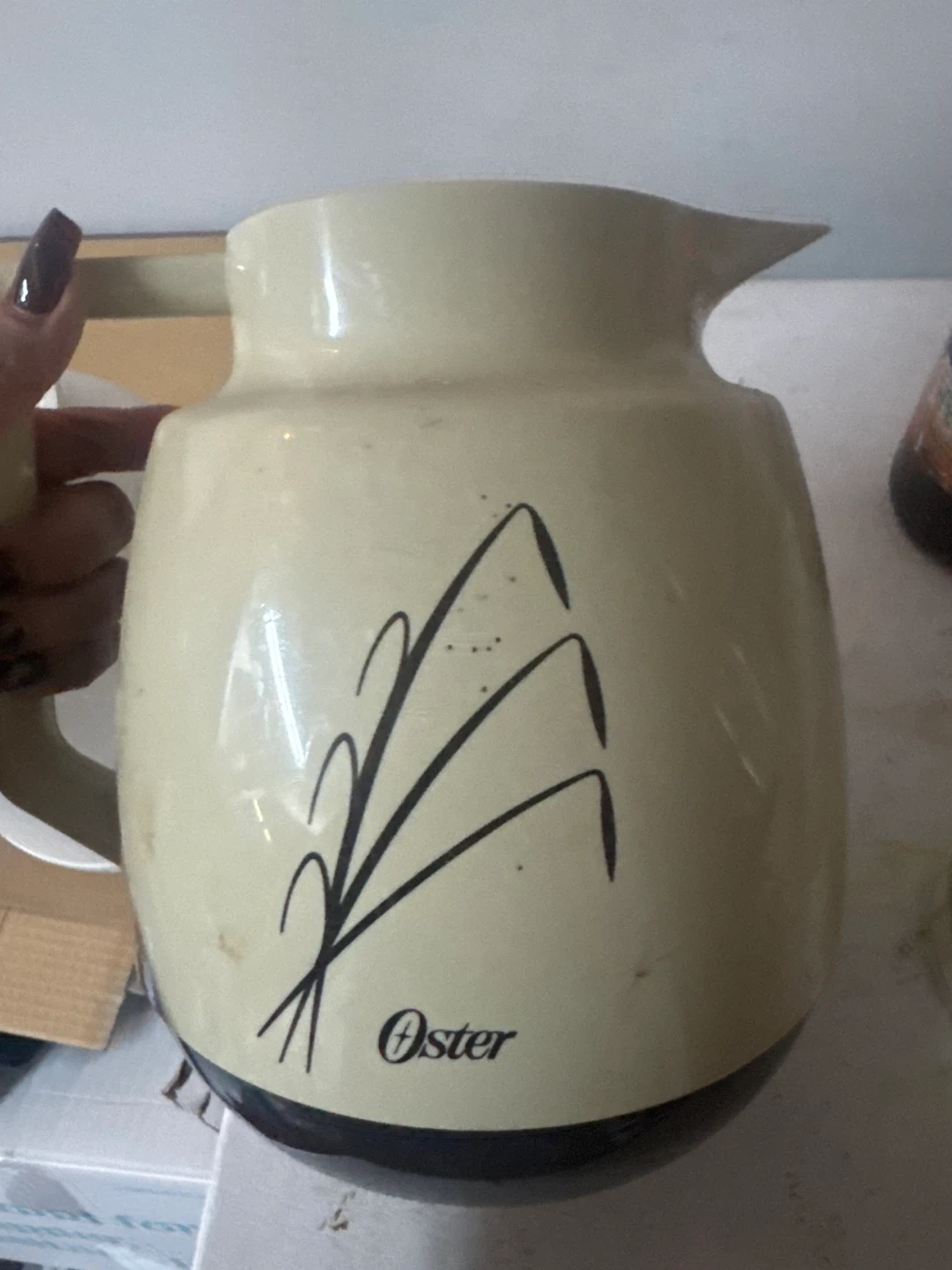 This is an Oster pitcher with a decorative design. It's made of a durable material and features a comfortable handle. The inner lining appears to be glass.