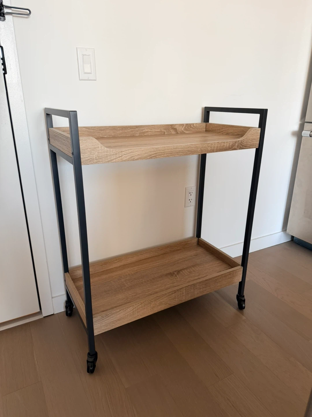 This bar cart has two wood-look shelves and a black metal frame. It's on wheels for easy movement. Great for serving drinks, as a coffee station, or extra storage!