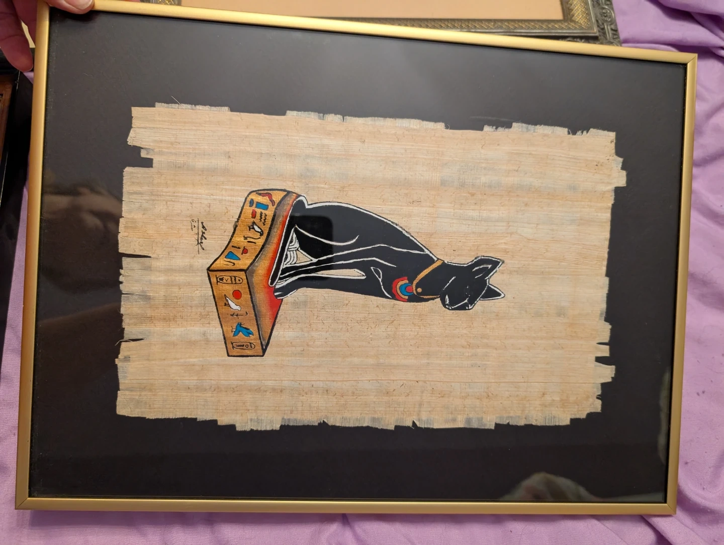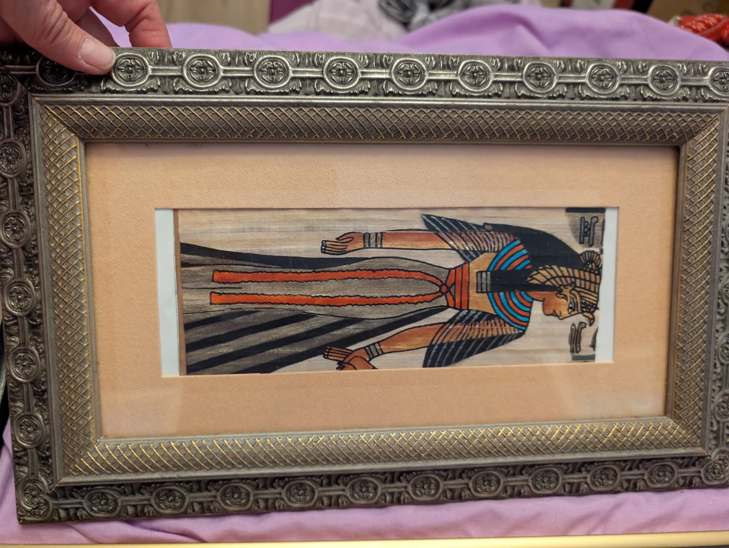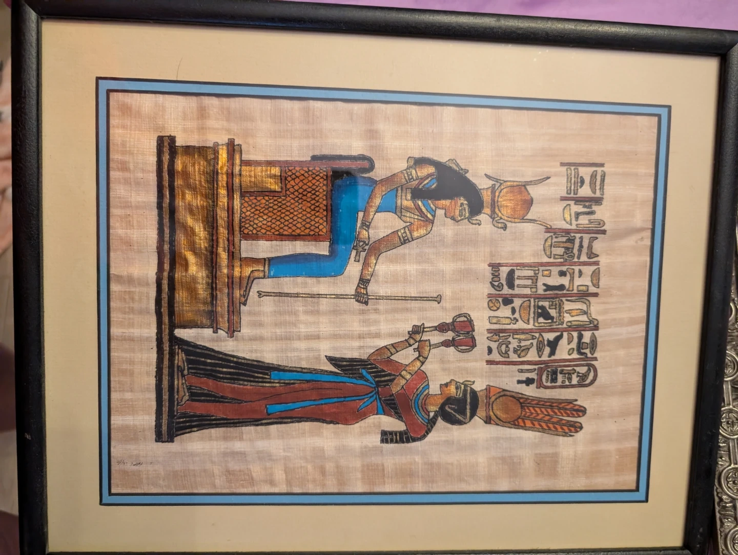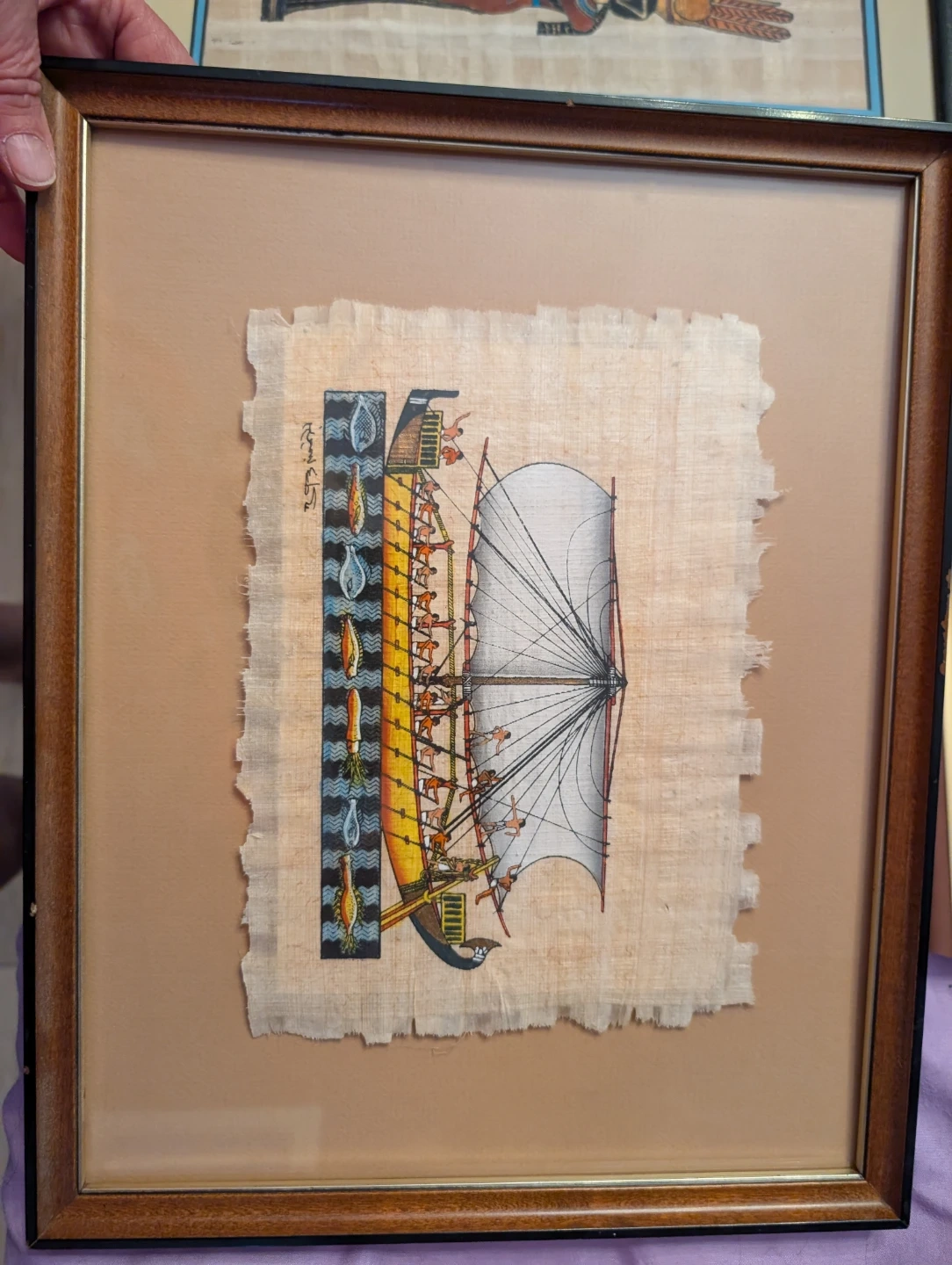 This lot includes four framed pieces of Egyptian papyrus art. Depicts a black cat, a pharaoh and attendant, a winged goddess, and a Nile river boat scene. The papyrus is handmade with unique textures. Comes ready to hang.