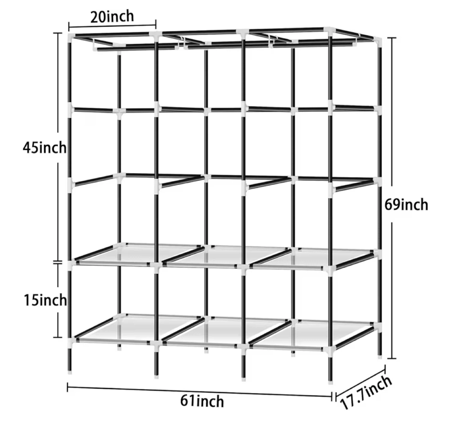 3 hanging rods, 6 storage shelves