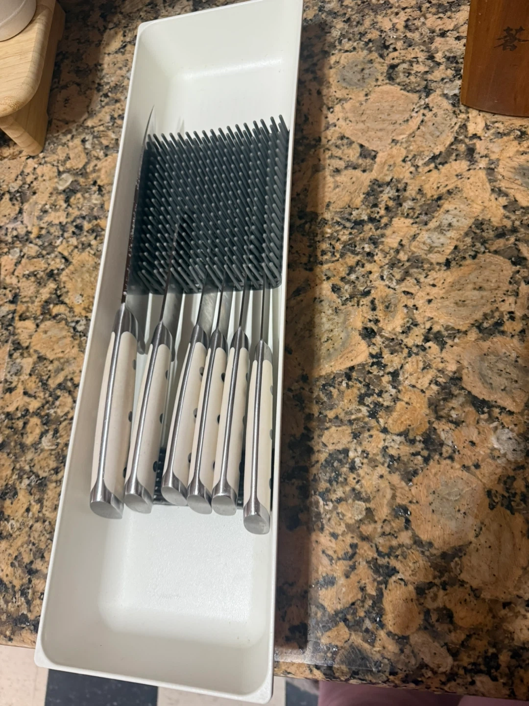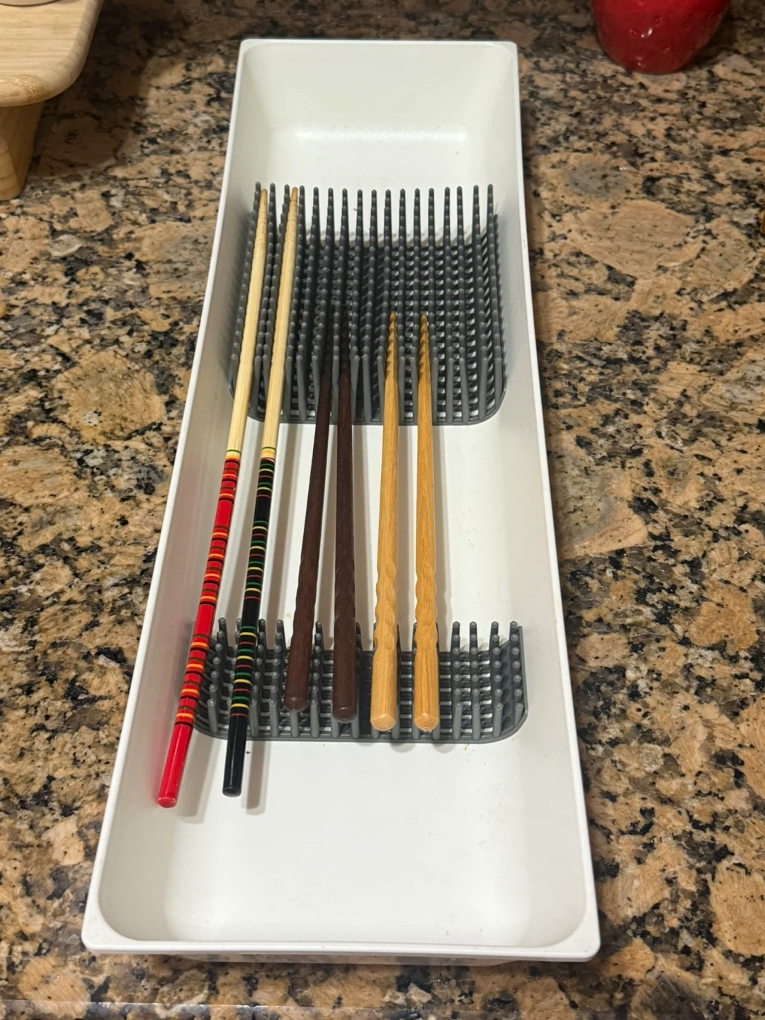 White plastic cutlery organizer tray. It holds knives, forks, spoons, and chopsticks. Utensils made of stainless steel and wood. A brown ceramic spoon is also included.