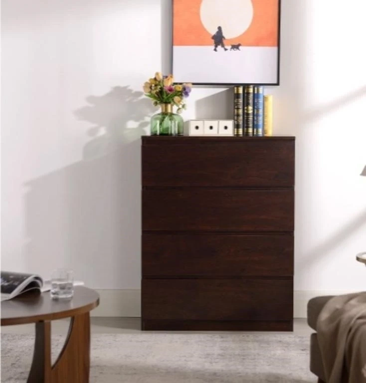 This dark wood dresser has five drawers for ample storage. It's a nice size for a bedroom or living space. Offers a sleek look for your home!