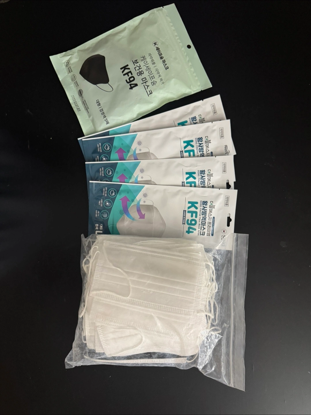 Selling a mix of KF94 face masks! There are black ones in a package of 5 (large size) and a bunch of white ones in a resealable bag. Perfect for keeping safe and comfortable.