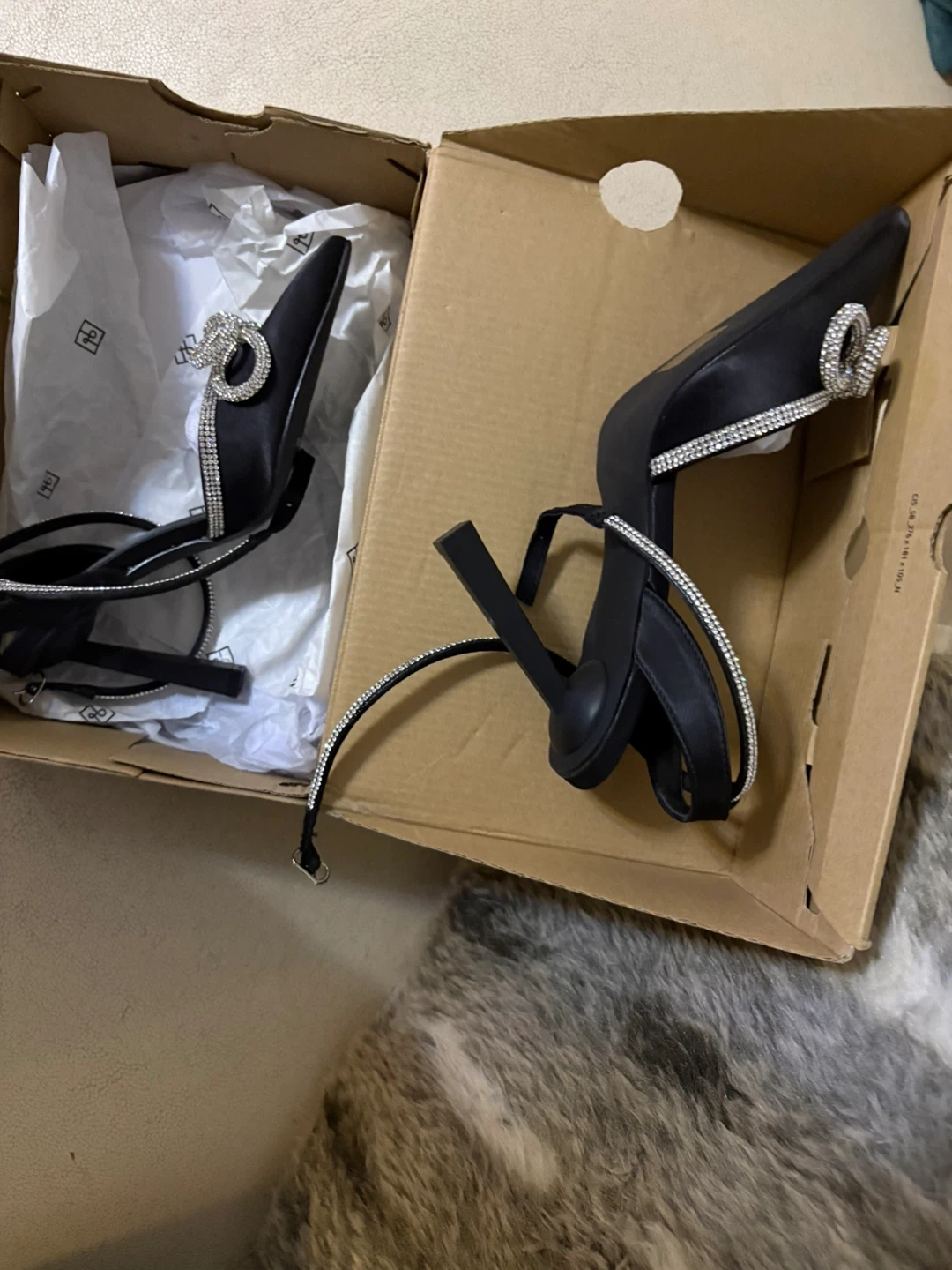 Elegant black heels from Call It Spring, embellished with sparkling rhinestones. These strappy heels feature a pointed toe and a comfortable ankle strap. They come with the original box. Perfect for dressing up any outfit!