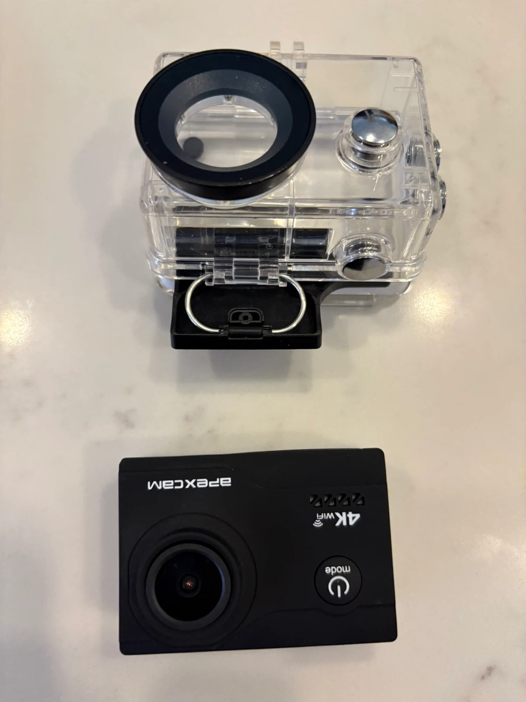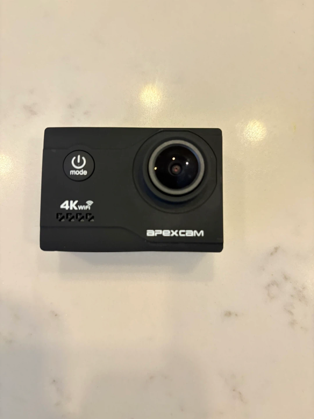 This ApexCam action camera records in 4K with WiFi capability. It comes with a waterproof housing and various mounting accessories. Includes battery charger and 2 batteries included. Great for capturing outdoor adventures!