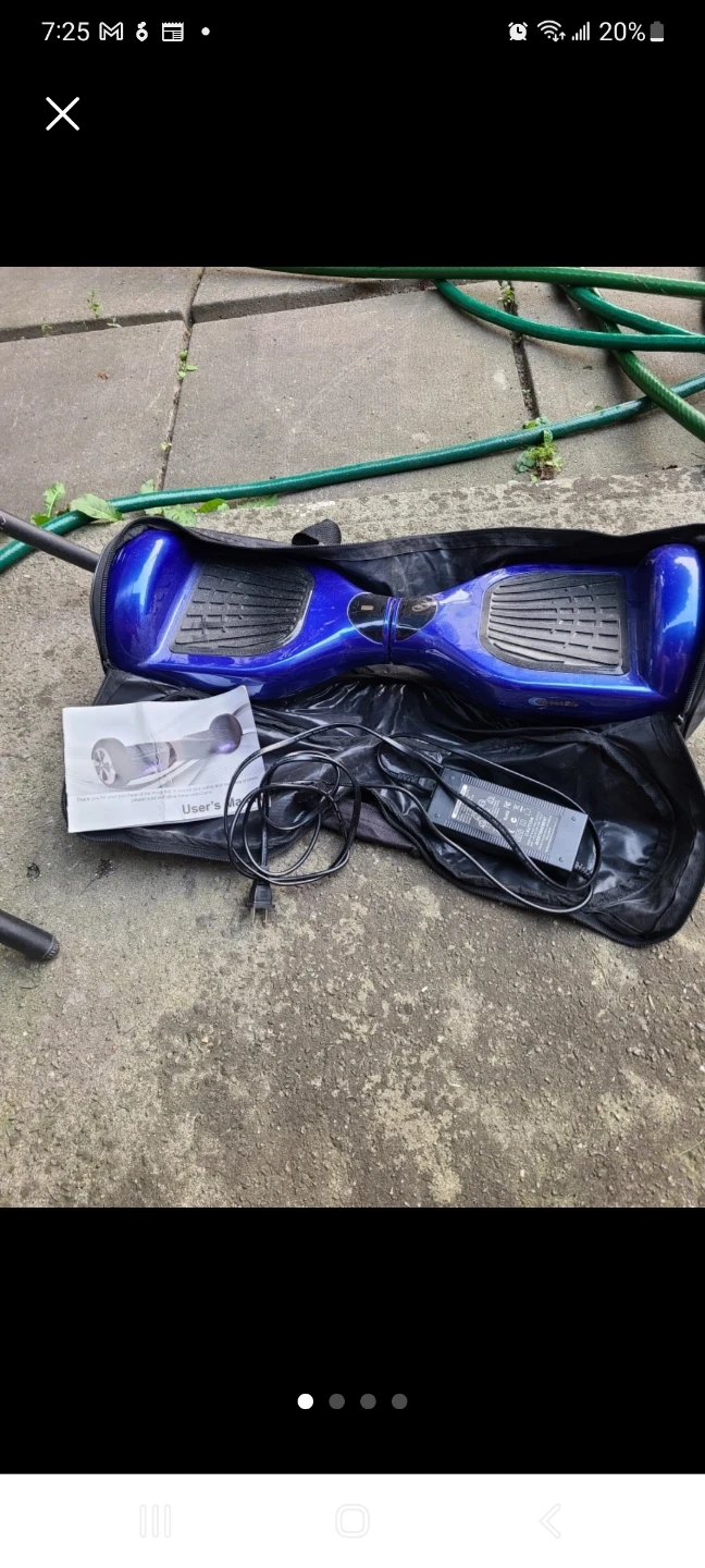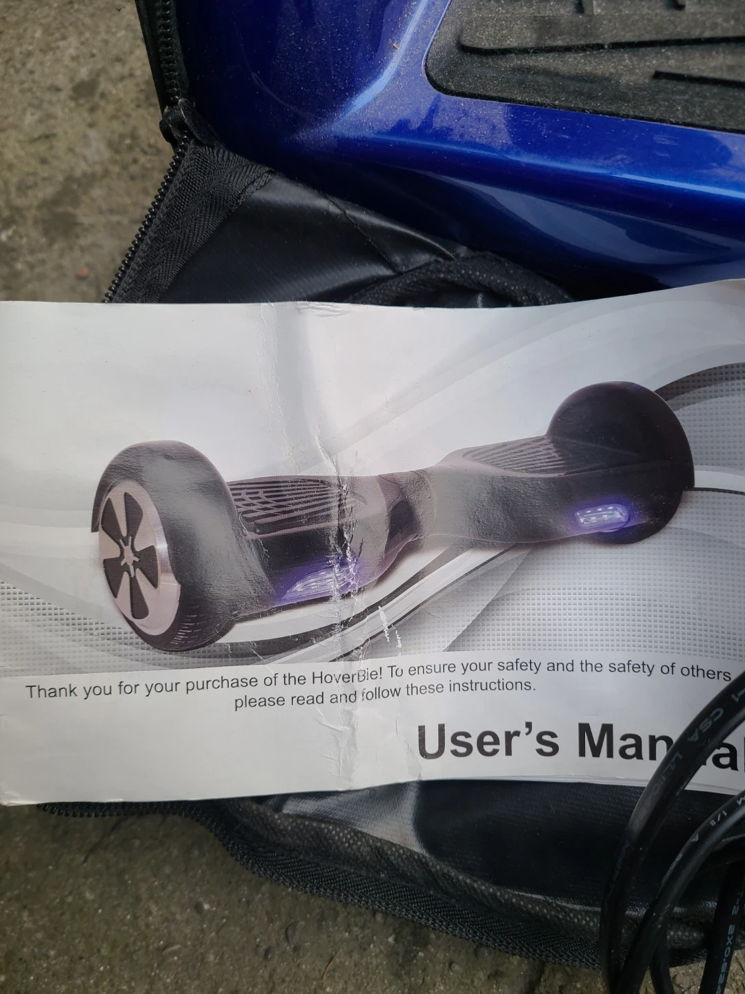 Blue hoverboard with a carrying bag, charger, and user manual. The charger is a 42V Li-ion battery switching power supply. It's blue and has a glossy finish.