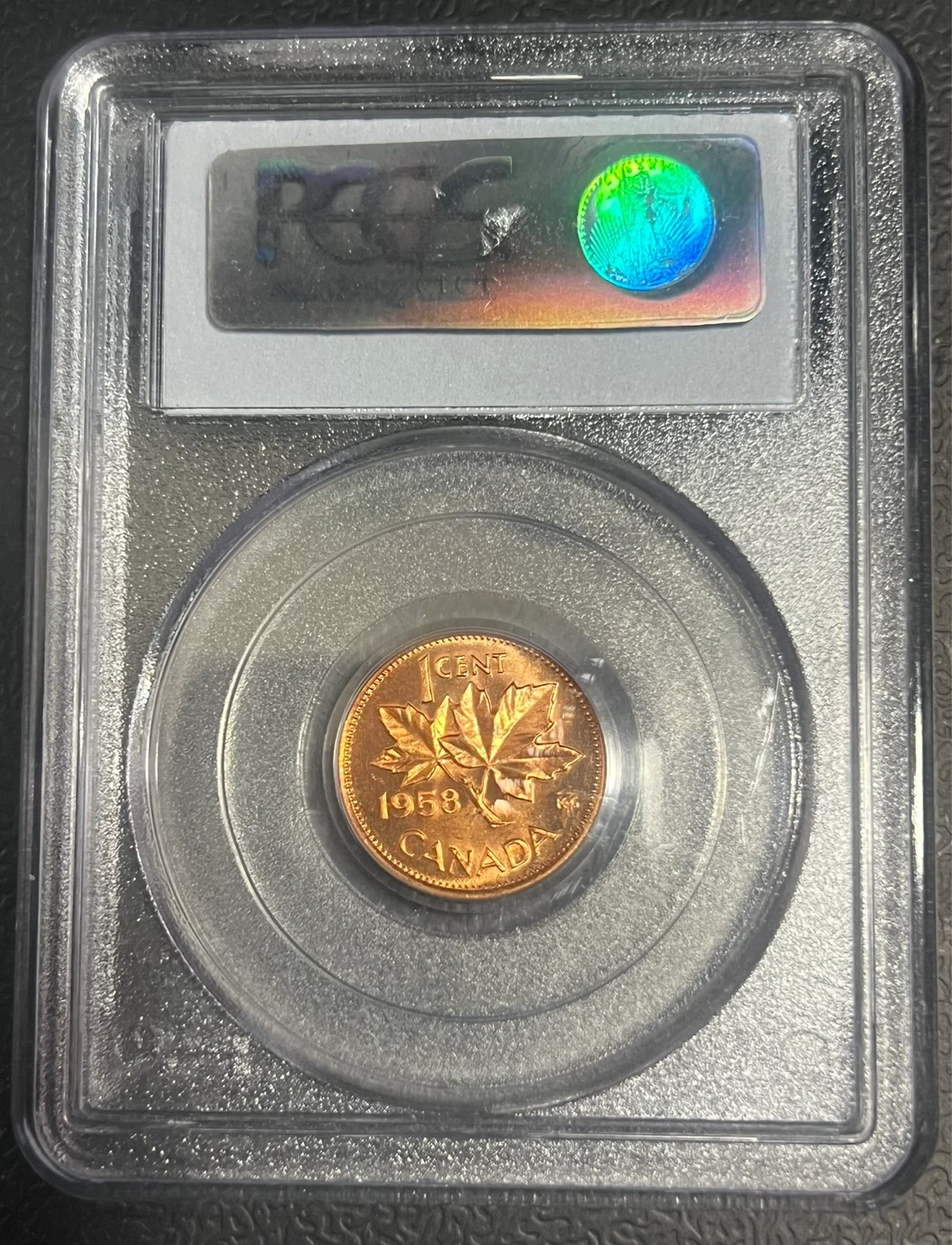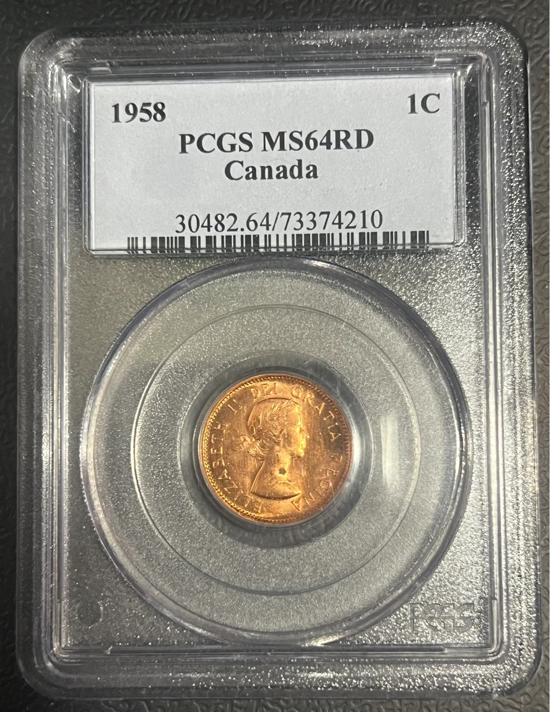 This is a 1958 Canadian one cent coin, graded MS64RD by PCGS. It's a beautiful copper coin with a maple leaf design. This coin would be a great addition to any Canadian coin collection!