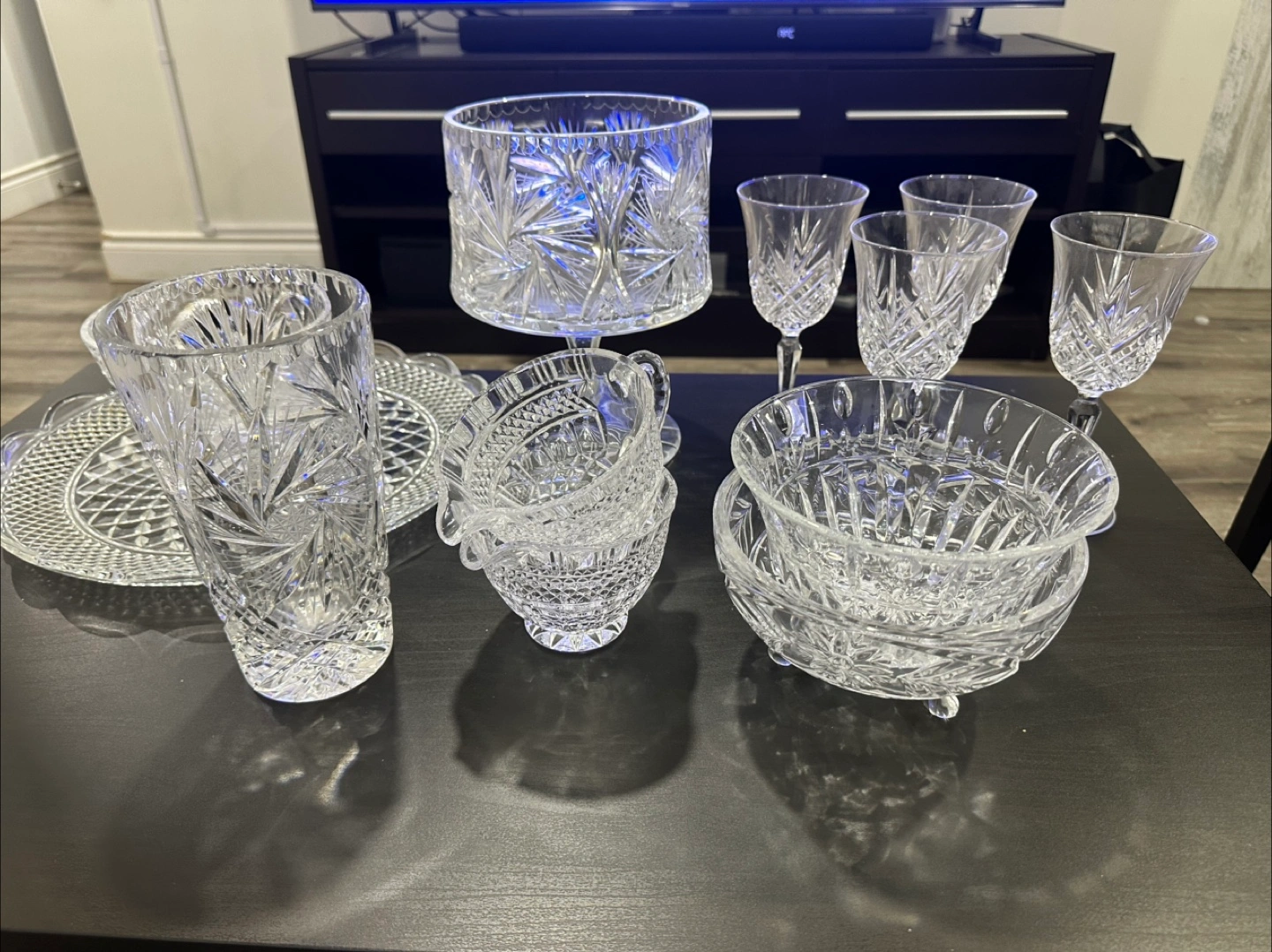Selling a beautiful set of crystal glassware. Includes a variety of pieces, perfect for adding a touch of elegance to your table setting. They're in great condition and ready for a new home!