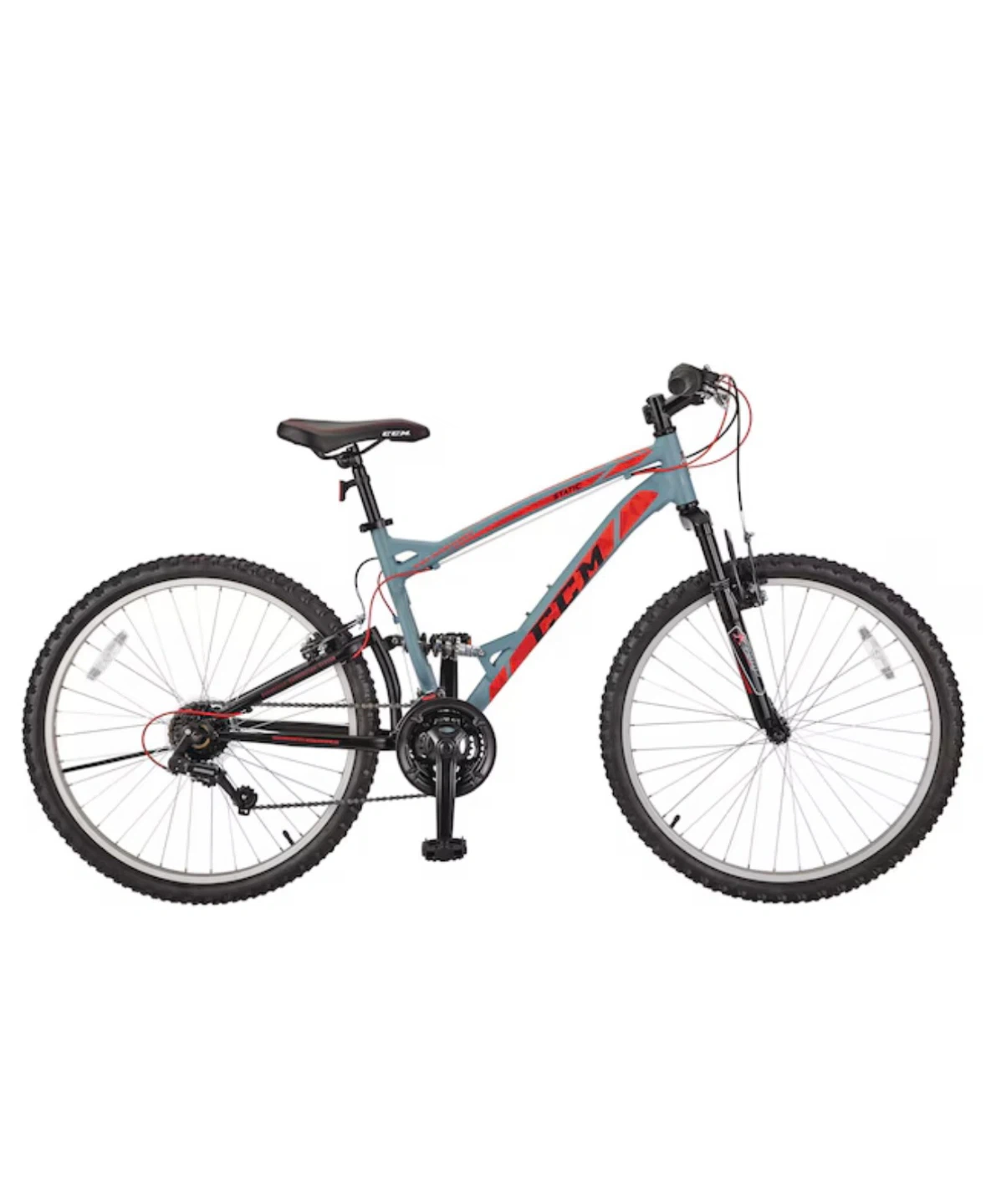 Grey CCM mountain bike with red accents. It has a front and rear suspension system. Includes a black wire basket on the handlebars. Good for commuting or trail riding!