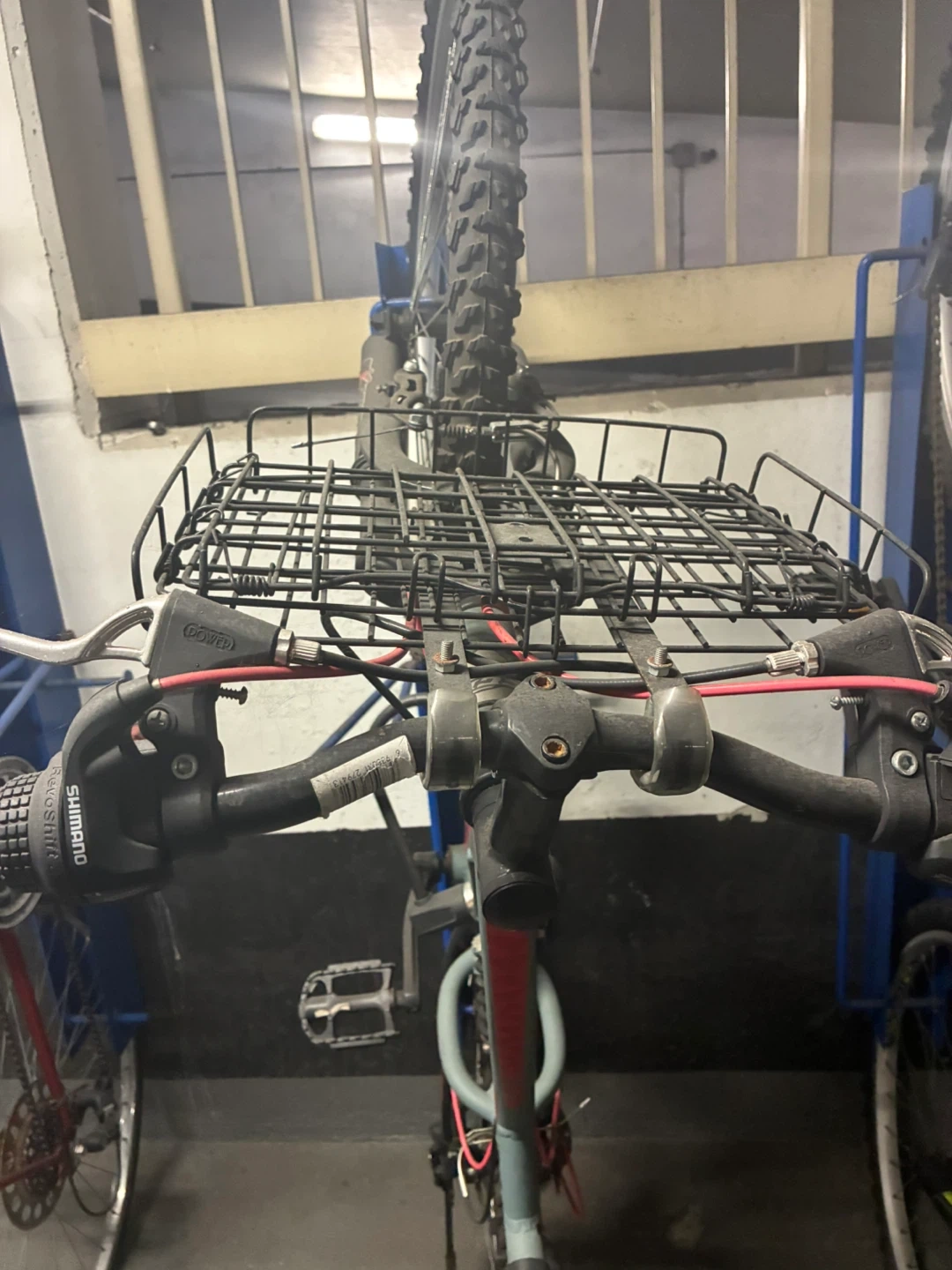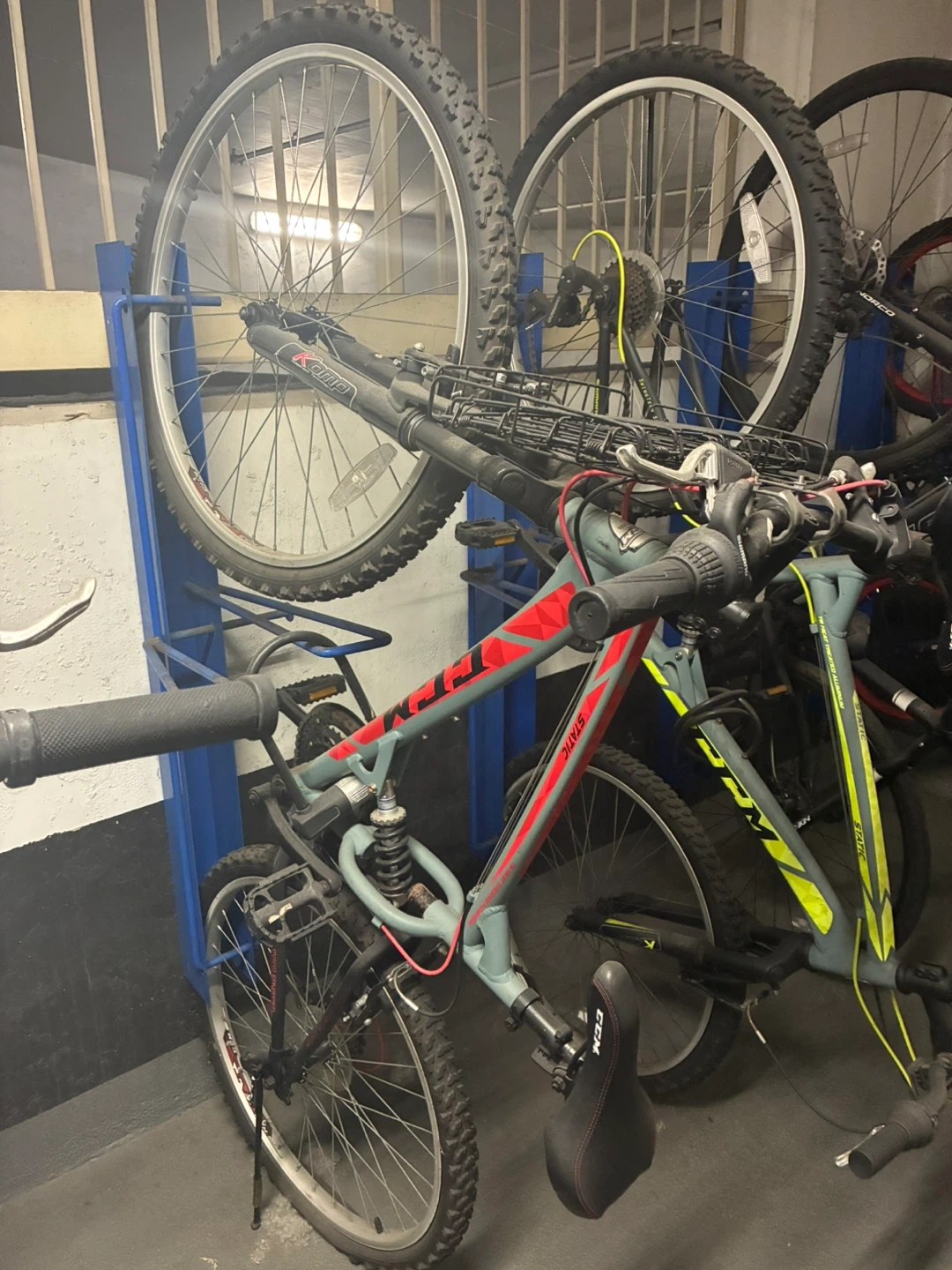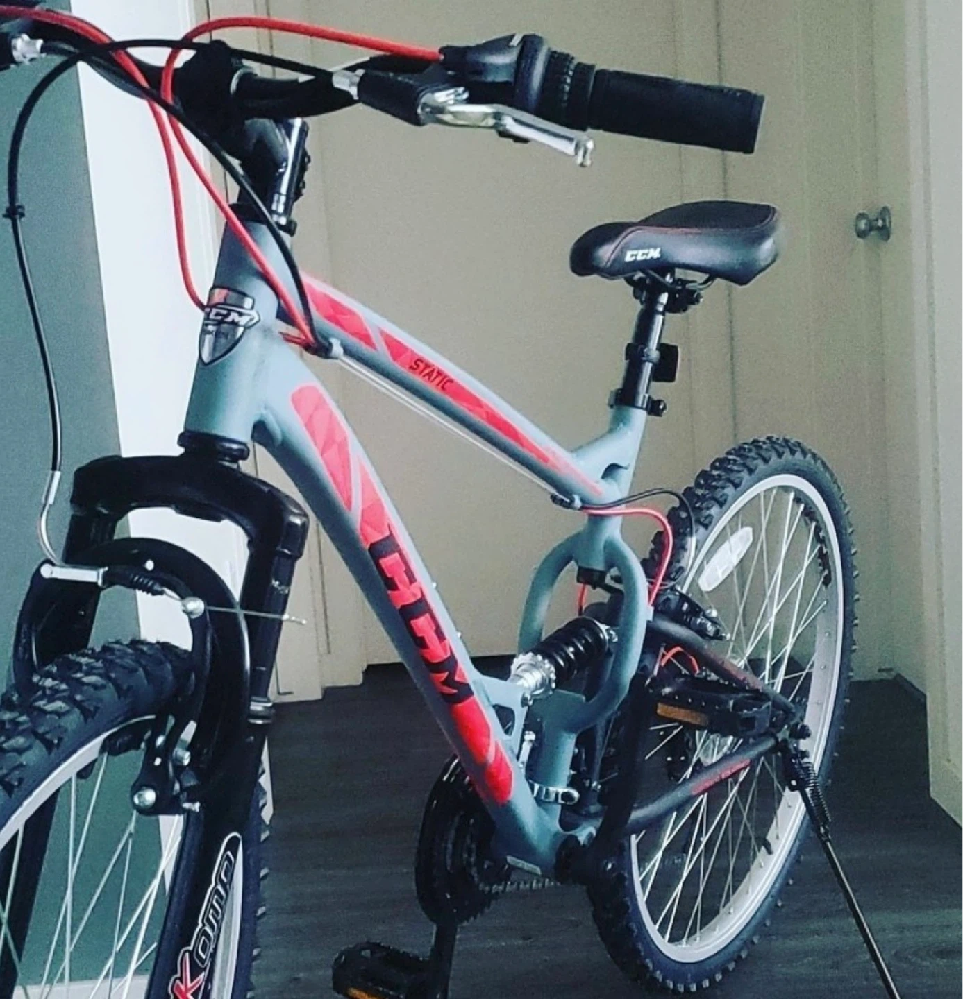 Grey CCM mountain bike with red accents. It has a front and rear suspension system. Includes a black wire basket on the handlebars. Good for commuting or trail riding!