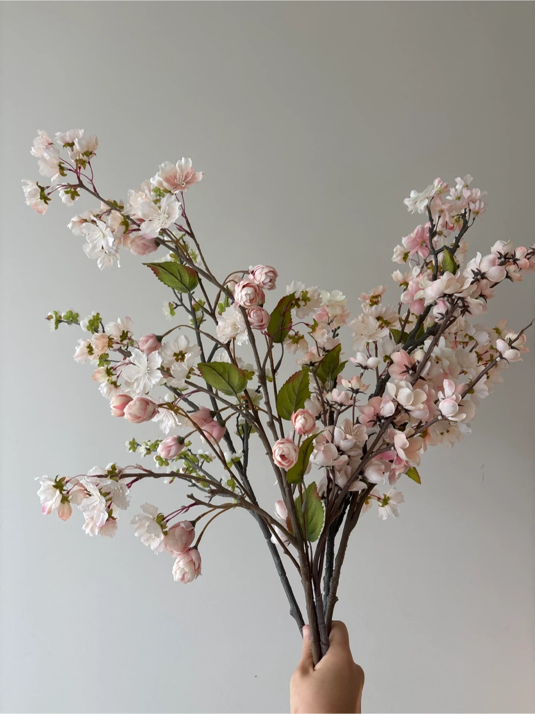 These artificial cherry blossom branches bring a touch of spring indoors. The branches have delicate pink and white flowers with green leaves. They're lovely for home decor or events!