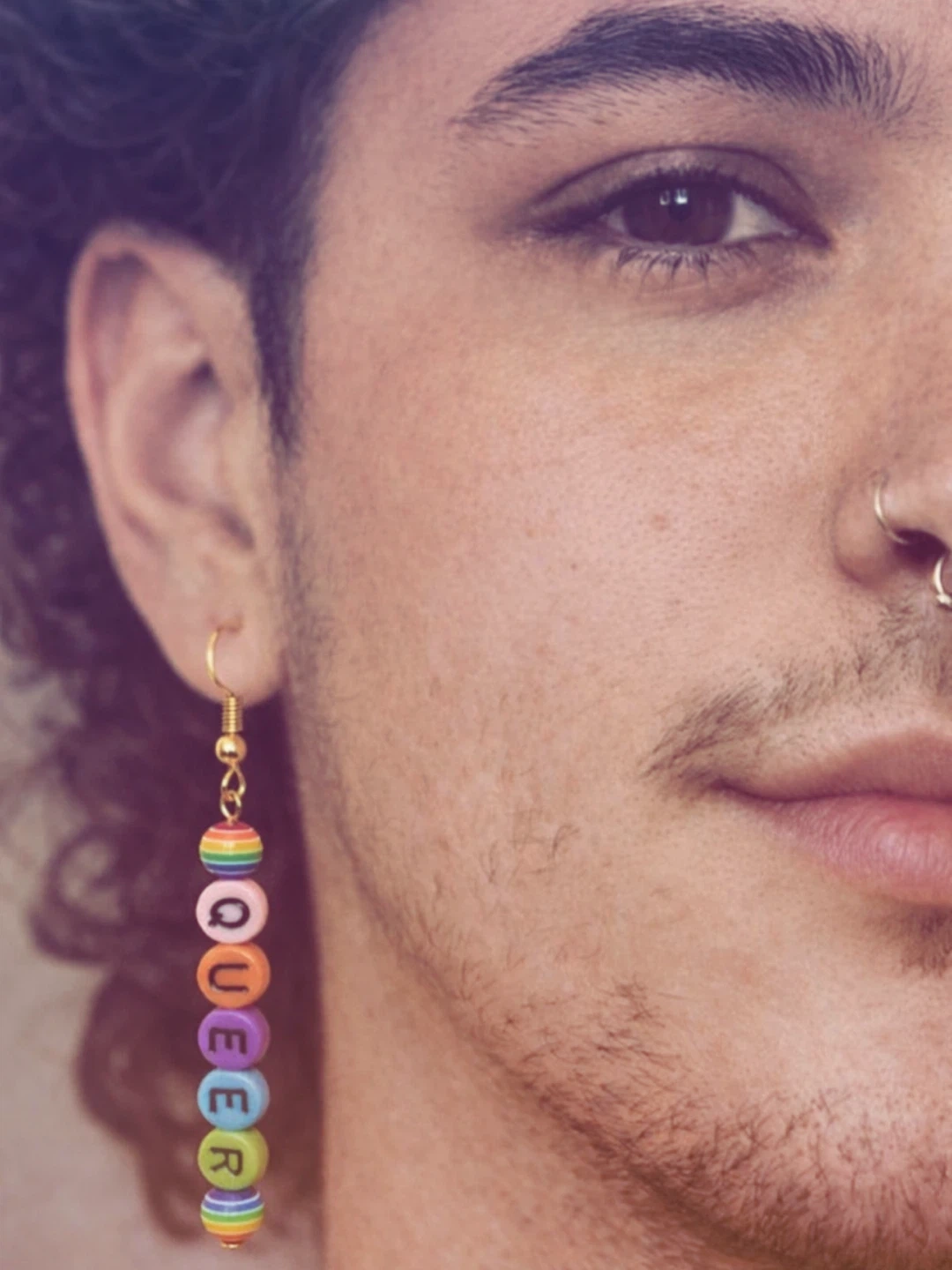 One dangle earring with colourful beads spelling out 'QUEER'. It's finished with a rainbow bead top and a gold-tone hook. Great for showing pride!