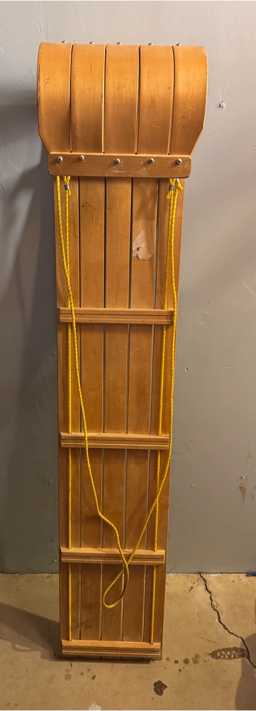 This is a classic wooden sled, perfect for a snowy day! It's made of durable wood and comes with a sturdy yellow pull rope. Its traditional design makes it a fun ride for kids and adults alike.