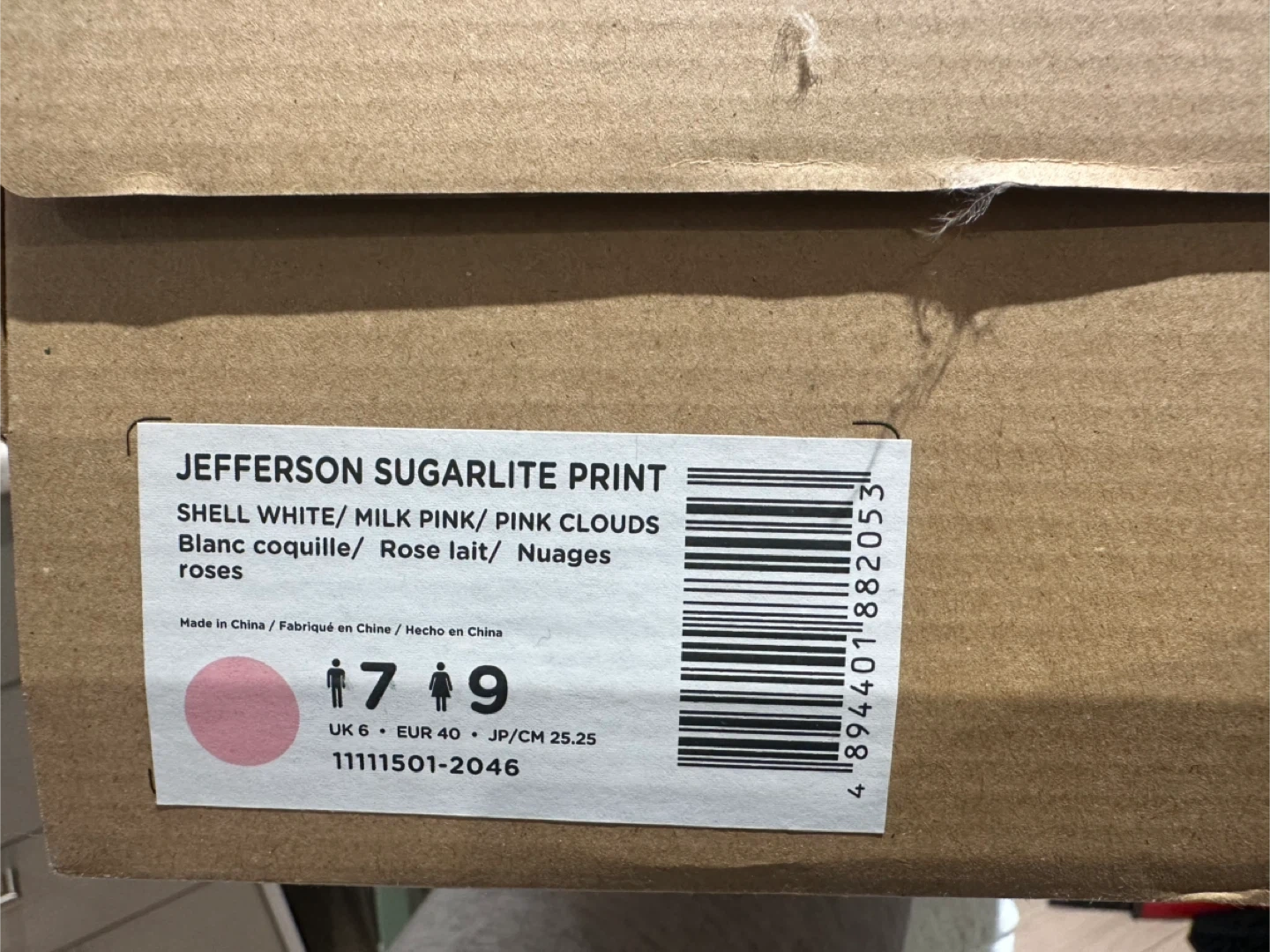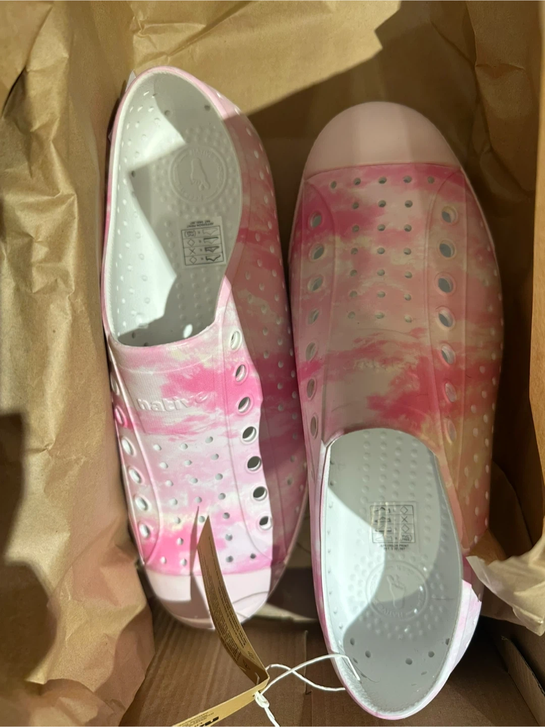 Native Jefferson Sugarlite Print shoes in a pink clouds tie-dye pattern. These are a size UK 6, EUR 40, JP/CM 25.25. They're made from a lightweight, waterproof material perfect for summer.