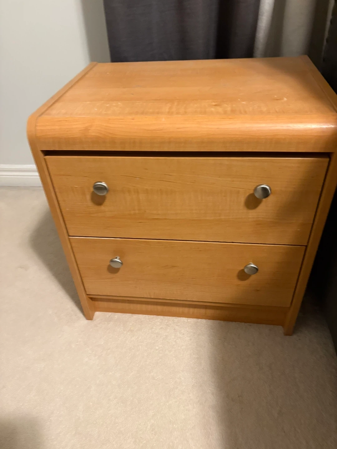 A two-drawer nightstand made of light-coloured wood. It has silver-coloured knobs for easy opening. This piece is great for keeping your bedroom tidy and essentials close at hand.