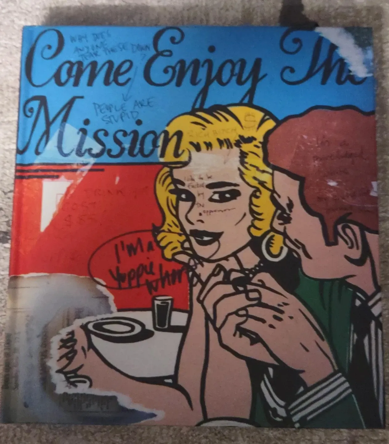 This is the 'Come Enjoy The Mission' book. It features a pop art style cover with various handwritten notes and doodles. The artwork is vibrant and eye-catching.