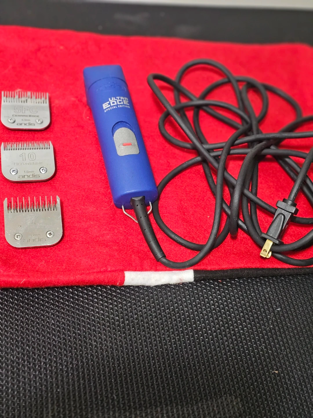 Includes an Andis UltraEdge special edition hair clipper with a cord. Comes with three blades: 5FC ceramic edge (6.3mm), #10 UltraEdge (1.5mm), and #7 UltraEdge (3.2mm).