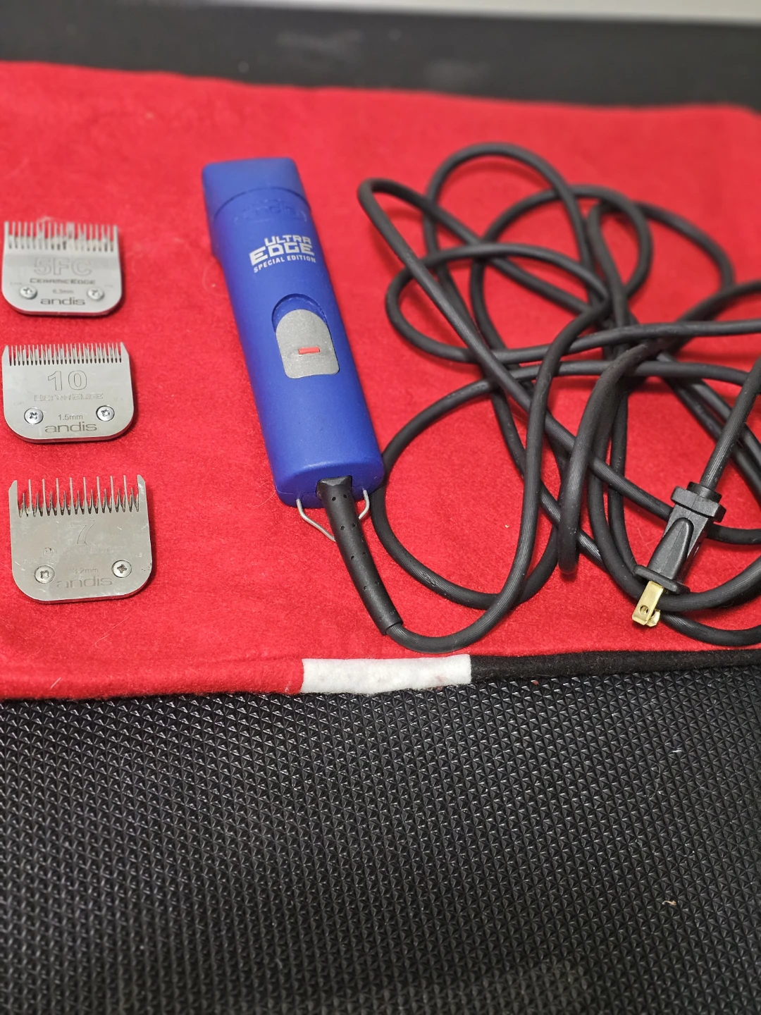 Includes an Andis UltraEdge special edition hair clipper with a cord. Comes with three blades: 5FC ceramic edge (6.3mm), #10 UltraEdge (1.5mm), and #7 UltraEdge (3.2mm).