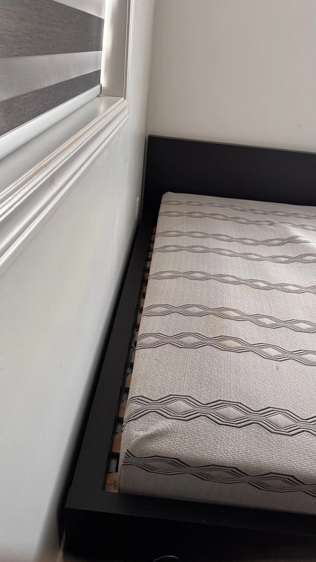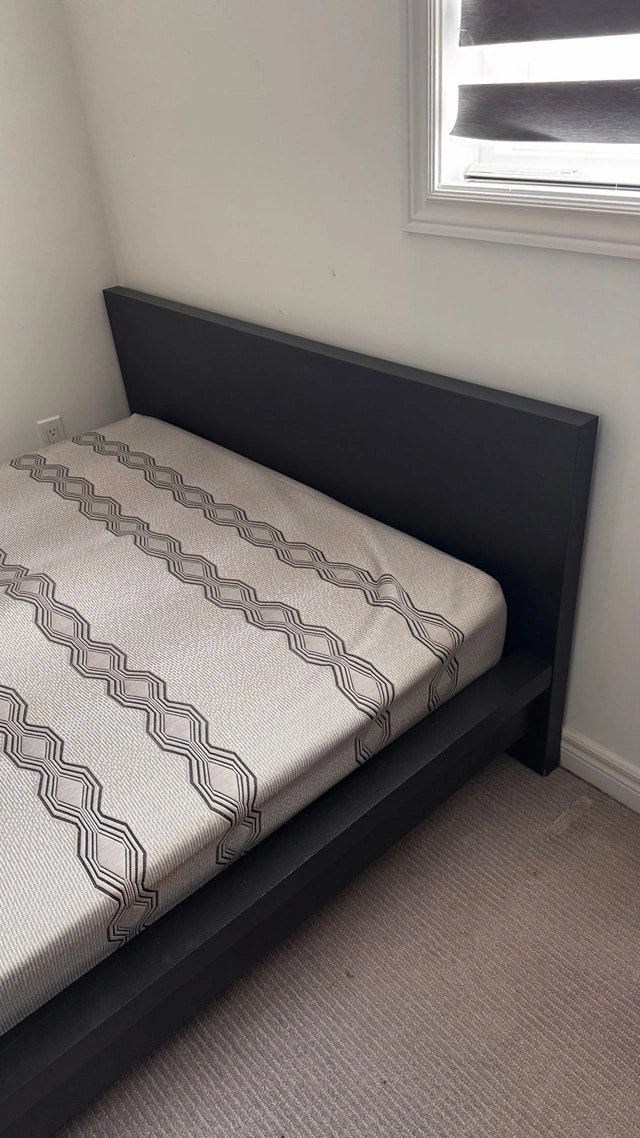 Selling a modern black double/full size bed frame with mattress included. Clean, simple design that fits any bedroom. Very solid and sturdy — no squeaking.