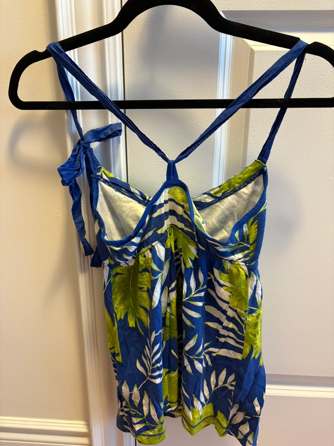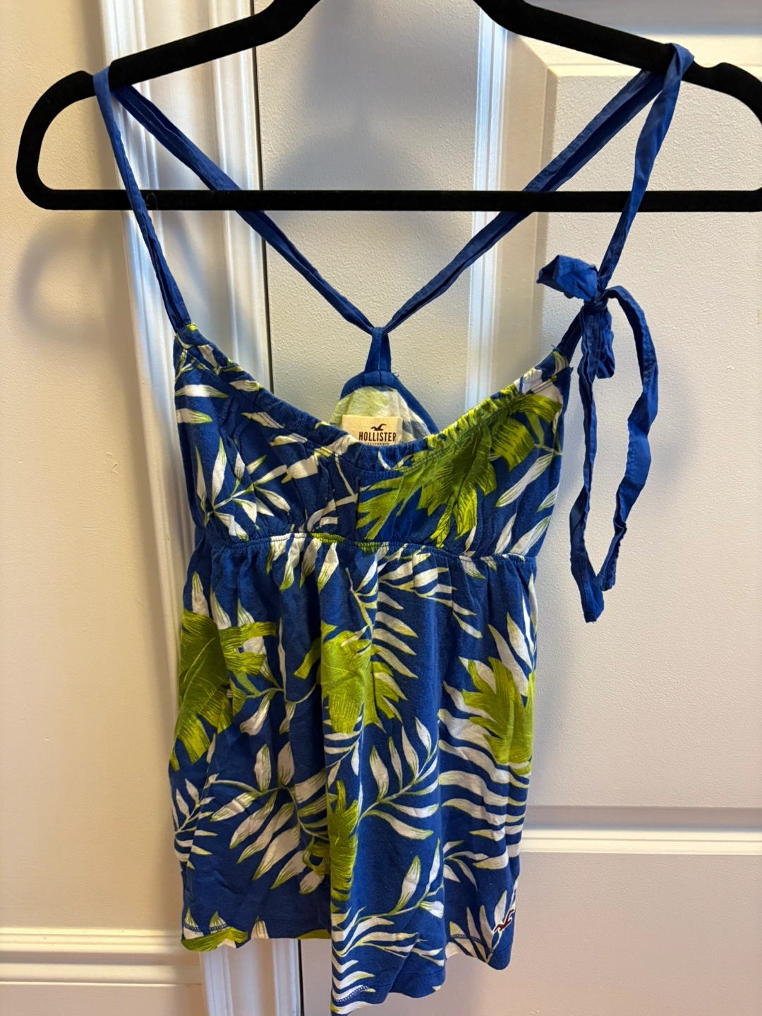 This Hollister tank top features a vibrant blue floral pattern. It's in great condition and perfect for summer days. There is a cute bow detail on left shoulder. It is a cross back
