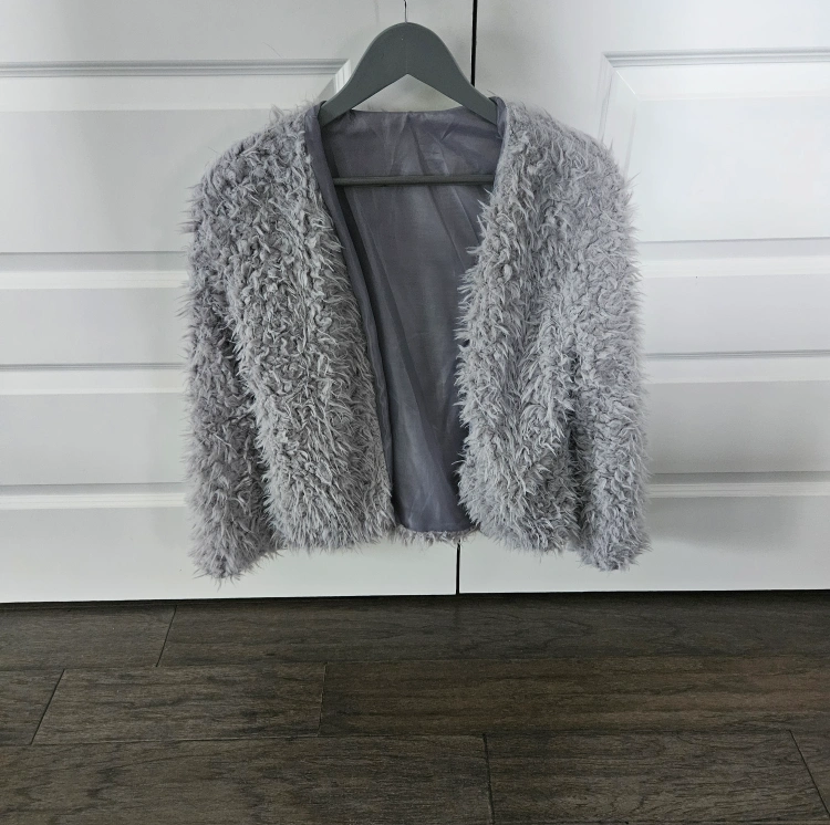 Selling a cozy grey faux fur cardigan. It's super soft and in great condition! Perfect for layering or adding a bit of texture to your outfit.
