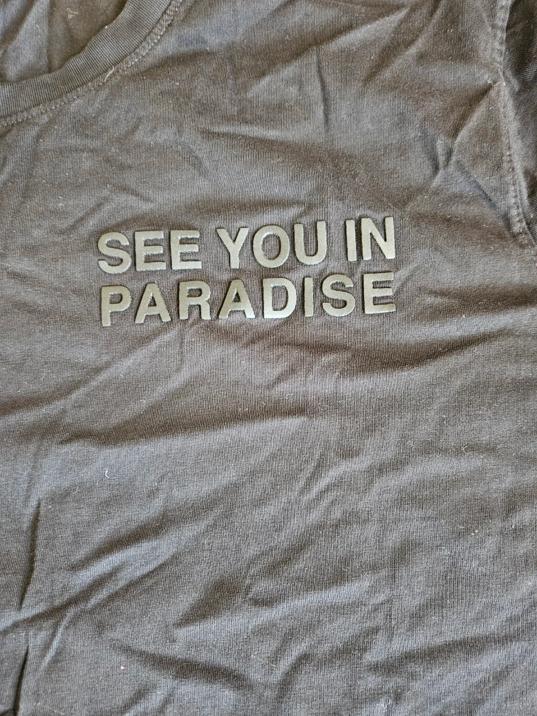 Black t-shirt with "See You In Paradise" graphic on the front and back. Size is 3XL. Cotton material. Measurements W22xL31.